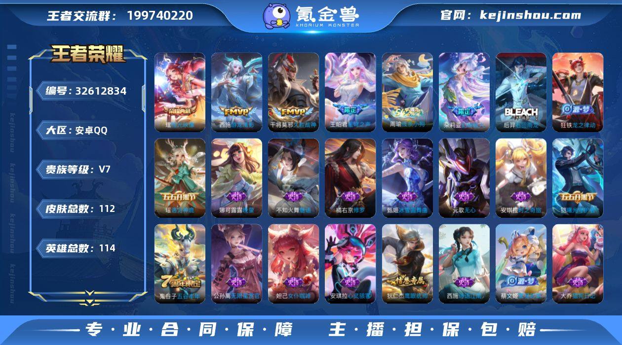 实名: 可修改 性别: 男号 贵族等级: V7 英雄数: 114 皮肤数: 112 荣耀水晶: 拾光映像 传说皮: 久胜战神,游龙清影 限定皮: 星穹之声,五谷丰年 亮点: 【优质装备】:拾光映像(瑶典藏),久胜战神,游龙清影(小青龙)