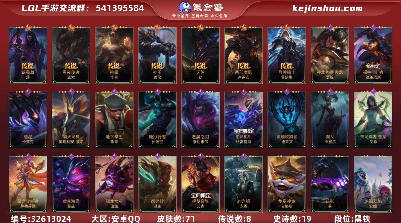 实名: 可修改 段位: 黑铁 皮肤数: 71 传说皮: 暗星尊,黑夜使者亚索,神拳盲僧,神王盖伦,天煞劫,西部魔影卢锡安,月蚀骑士蕾欧娜 亮点: 【LSC552】90英雄/71皮肤/1神话/8传说/19史诗/流光翡翠/此志凌云 嘉文四世/神王盖伦/暗星尊/黑夜使者亚索/天煞劫/西部魔影卢锡安/月蚀骑士蕾欧娜/神拳盲僧/西部魔影 永恩/地狱行者猴子/探梦奇旅艾克/恶魔之刃/暗星螳螂/霸天龙神龙王/星之守护者萨勒芬妮/驯龙女巫/魔女青钢影/地下拳王/神龙尊者 炎龙 瑟提/心之钢永恩/福牛守护者诺手/绝命机甲男枪/灵魂收割者/神龙尊者 苍龙/虚空海灵/欧米伽小队 天雷爆破手 维迦/怨之砂/游梦仙境 莉莉娅/s1光耀之刃/s2光耀之芒/s5绯金魅影/s6绯金丽刃/s7绯金战斧/s8绯金鮫灵/s9王牌舰长/s10王牌上将/S11王牌勇将/s11王牌司令/s12龙冕先锋/s14龙冕神策/s16冠翎飞行员/S18冠翎巨神像/S19冠翎征服者/光耀之刃蛮王/秘密特工/龙冕先锋赵信/光耀之芒金克丝/王牌舰长/冠翎征服者 尼菈/绯金魅影(可升级)/钢铁意志/银色之牙/绯金丽刃(可升级)/擂台皇帝/冰霜烈焰/西部牛仔亚索/冲击之刃劫/光明骑士贾克斯/兔宝宝提莫/声威黠影 提莫/邪恶女巫/冰霜亚龙/女警官/孤胆英豪/王牌上将皇子/至高之拳/冠翎飞行员 库奇/创世魔...