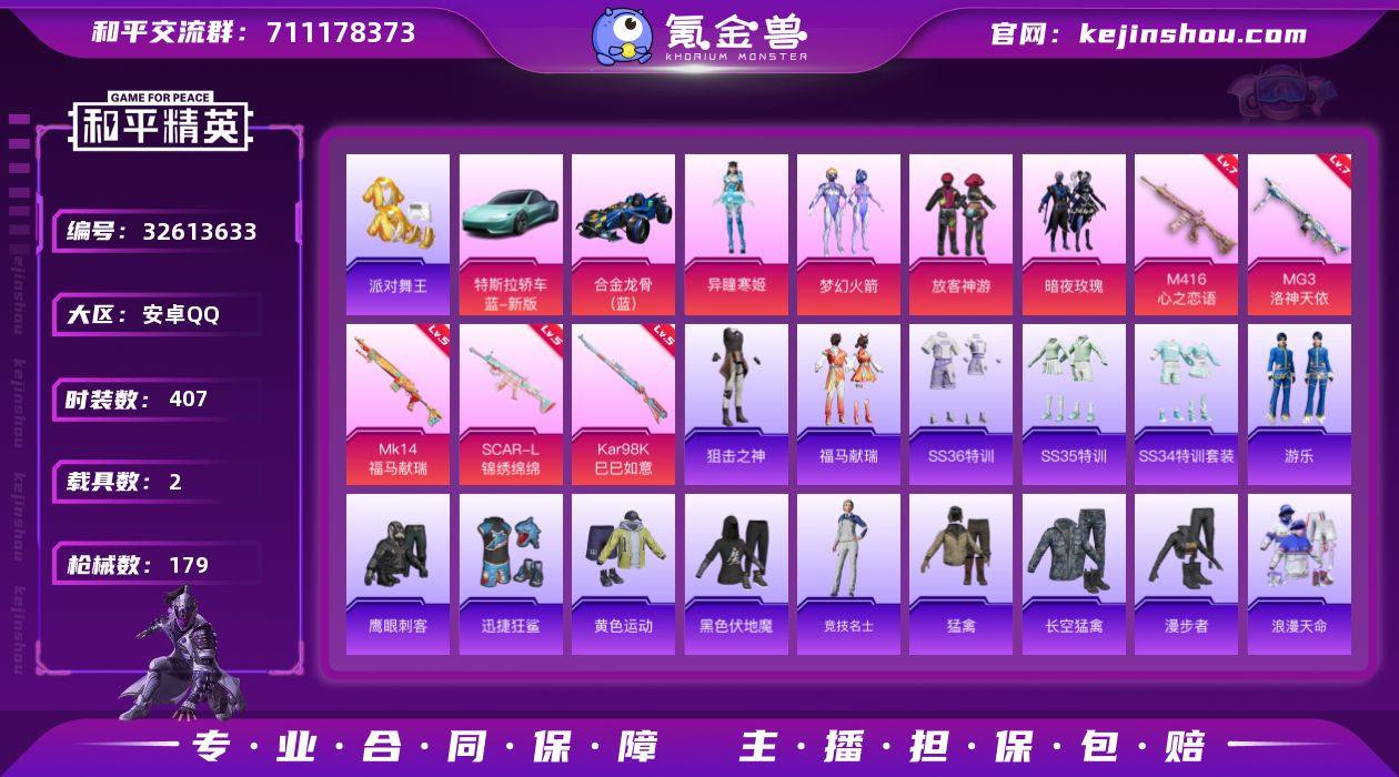 实名: 可修改 时装数: 407 载具数: 2 枪械数: 179 战备数: 2 热门装扮: 梦幻火箭(新101),放客神游,迅捷狂鲨,鹰眼刺客,暗夜玫瑰,派对舞王,异瞳寒姬 载具: 合金龙骨(蓝),特斯拉Roadster(水滴蓝) 稀有枪皮: MG3洛神天依,M416心之恋语,SCAR-L-锦绣绵绵,Kar98K-巳巳如意,MK14-福马献瑞 亮点: 【优质装备】:派对舞王(小金鞋),舞王派对(派对舞王、小金鞋),暗影哥特(红眼罩),萌熊伴侣背包(粉熊背包),七级MG3-洛神天依,七级M416-心之恋语