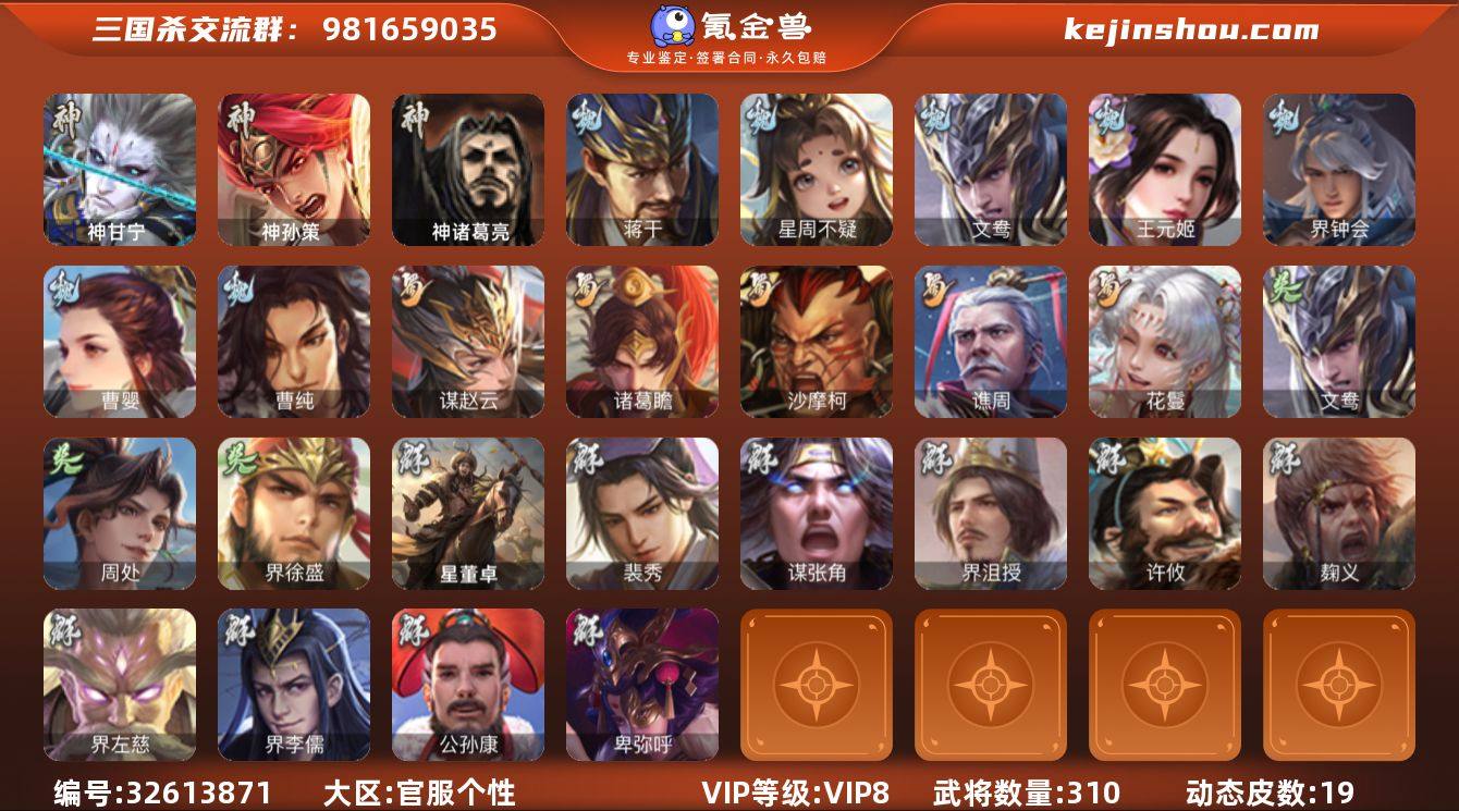 神甘宁,神孙策,神周瑜,神诸葛亮,星周不疑,文鸯,王元姬,界钟会,曹婴,曹纯,蒋干,谋赵云,诸葛瞻,沙摩柯,谯周,花鬘,周处,界徐盛,裴秀,界沮授,麹义,界左慈,界李儒,公孙康,卑弥呼,鲍信,谋张角,张绣,李傕,许攸,友徐庶,星董卓,神张辽-散敌擒孙,神甘宁-万人辟易(动态),郭嘉-以身证道(动态),星周不疑-才广志宏(动态),张昌蒲-龙年端午(动态),曹丕-气荡山河(动态),甄姬-明珠耀躯(动态),SP蔡文姬-兔年冬日(动态),界曹植-鼠年端午(动态),王元姬-鼠年冬至(动态),太史慈-涤荡江东(动态),周处-义除三害(动态),吕蒙-剑起惊澜(动态),孙权-永开吴祚(动态),孙权-猪年端午(动态),界孙权-猪年端午(动态),徐盛-破军杀将(动态),孙鲁育-猪年春节(动态),高顺-每战必克(动态),袁绍-声震寰宇(动态),貂蝉-绝世倾城(动态),吕布-虓虎之勇(动态),界吕布-虓虎之勇(动态),界貂蝉-绝世倾城(动态)