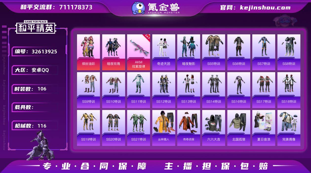 【938718】安卓 手Q-2粉装-1特效枪-0载具-0粉色飞行器-36506热力值-3王牌印记-106套装-116枪皮 【热门品类】:粉装-缤纷油彩 【粉色套装】:粉装-缤纷油彩,粉装-暗夜玫瑰 【粉色枪皮等级】:AKM-炫紫旋律(七级) 【粉色枪皮】:AKM-炫紫旋律 【粉色降落伞】:深海曼妙降落伞,梦幻火箭降落伞,PEL轰鸣竞梦者降落伞,神秘黑猫降落伞,齐天大圣降落伞,碧影闪光降落伞 【稀有枪皮】:AKM-彩虹符号,AKM-春暖花开,AKM-灼热熔岩,AKM-生命誓言,AKM-萌趣颜团子,AKM-虎虎生威,AKM-霓虹街区,M16A4-凝视深渊,M16A4-幻世战舞者,M16A4-蓝色火焰,SCAR-L-夏日绵绵冰,SCAR-L-玉兔迎春,SCAR-L-红色方程式,M416-夜灯,M416-红色方程式,GROZA-异彩先驱,GROZA-影袭,GROZA-黑色刀锋,AUG-耀粉歌者,QBZ-原初圣火,QBZ-飞驰魅影,M762-拳皇97,M762-牛气冲天,M762-瑞龙福将,Mk47-粉色回忆,G36C-暗夜玫瑰,UZI-众神之王,UZI-炫彩节奏,UMP45-生命誓言,UMP45-蓝色火焰,Vector-暗夜玫瑰,Vector-生命誓言,Vector-黑色刀锋,汤姆逊-勇闯险境,汤姆逊-异彩先驱,汤姆逊-炫彩节奏,汤姆逊-耀粉歌者,汤姆逊-像素花束,野牛-电玩视界,MP5K-众神之王,MP5K-异彩先驱,MP5K-蓝莓炮弹...