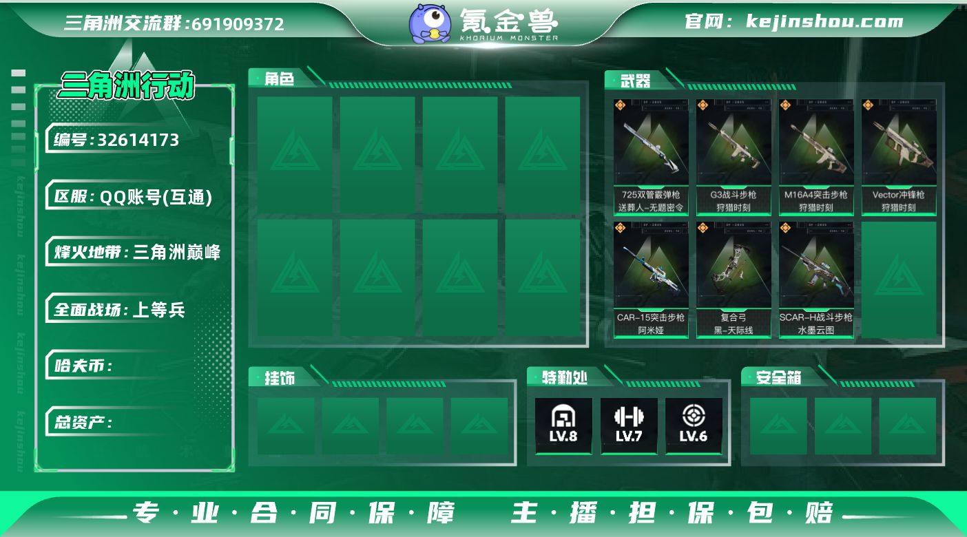 总资产:66.8M 2干员外观 2近战传说 32传说枪械 哈夫币:417.657K 可二次 顶级安全箱(3×3)4.11号到期 可修改实名 【烽火地带段位】三角洲巅峰 【全面战场段位】上等兵 【干员外观】蛊-不羁人生,红狼-电锯惊魂 【传说武器皮肤】近战武器-处刑者,近战武器-暗星,SCAR-H战斗步枪-水墨云图,G3战斗步枪-骑士,勇士冲锋枪-能天使-午夜邮差,M250通用机枪-骑士之心,SCAR-H战斗步枪-启航,KC17突击步枪-电锯惊魂,AWM狙击步枪-万金泪冠,.357左轮-缄花,SR-25射手步枪-缄花,M14射手步枪-缄花,勇士冲锋枪-万金泪冠,47突击步枪-悠然茶歇,AUG突击步枪-悠然茶歇,UZI冲锋枪-悠然茶歇,腾龙突击步枪-万金泪冠,Mini-14射手步枪-夜莺,SKS射手步枪-骑士,G3战斗步枪-狩猎时刻,47突击步枪-暗星,4冲锋枪-夜莺,SR-3M紧凑突击步枪-暗星,K416突击步枪-行动记录,腾龙突击步枪-马年祥瑞,G18-马年祥瑞,Vector冲锋枪-夜莺,M16A4突击步枪-狩猎时刻,Vector冲锋枪-狩猎时刻,725双管霰弹枪-送葬人-无题密令,CAR-15突击步枪-阿米娅,复合弓-黑-天际线
