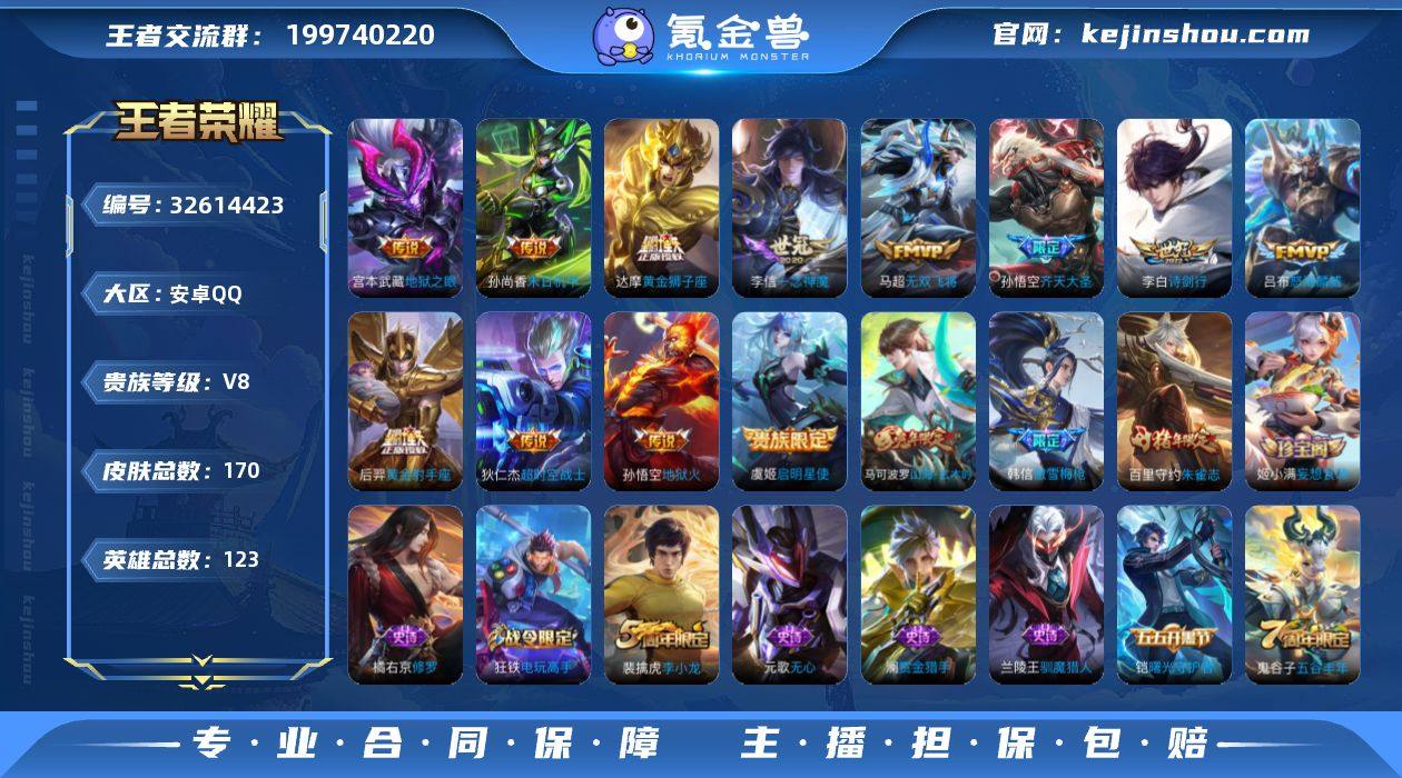 实名: 可修改 性别: 男号 贵族等级: V8 英雄数: 123 皮肤数: 170 传说皮: 黄金狮子座,黄金射手座,一念神魔,末日机甲-孙尚香,地狱火,地狱之眼,超时空战士-狄仁杰,无双飞将 限定皮: 李小龙,梁祝,朱雀志,傲雪梅枪,五谷丰年,诗剑行,降魔,怒海麟威,山海·玄木吟,齐天大圣 亮点: 【优质装备】:黄金狮子座,黄金射手座,一念神魔,末日机甲-孙尚香(绿蚂蚱),地狱火,地狱之眼,超时空战士-狄仁杰,无双飞将