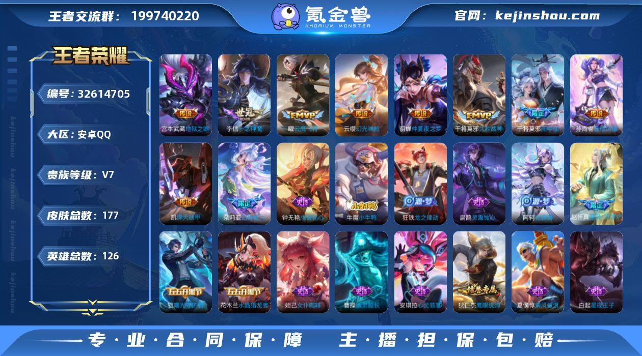 V7 18传说 126英雄 177皮肤 可修改实名 男号 【英雄全皮】大禹全皮 【稀有英雄】大司命,韩信(韩跳跳),夏洛特(夏师傅),艾琳,橘右京(橘子),娜可露露(鸟人),不知火舞,赵云,金蝉(唐僧),戈娅 【传说皮】神骥·聚万邦,神骥·越千峰,神骥·鸣幻洲,典韦战鼓燎原,幻光神枪,神树通天,万灵伏威,千山共赴,仲夏夜之梦(大飞蛾),地狱之眼,一念神魔,久胜战神,云鹰飞将(小将军),绛天战甲(鸡嘴战神),音你闪耀(rap皮),画中仙 【珍宝阁皮】妄想食味,蔷薇恋人 【赛季/战令皮】噬灭天穹(s37),古海寻踪(s33),海盐诗旅(s30),擒涛扼浪(s31),探海日志(s32),天穹祈灯(s34),演武夺筹(s23),驱傩正仪(s24),千军破阵(s25),沙漠行僧(s26),金庭之子(s27),大漠名商(s28),云中旅人(s29) 【史诗皮】百晓客,器灵·浮梦炉,化蝶舞,织梦人,撼世英歌,线条小狗-周瑜,九幽镇关,线条小狗-小乔,巫礼祀神,万灵启世,涂山容容,灵蛊蚀心,龙之律动,小牛鸭,戍鼓铭心,百相守梦-黄忠,幻珠鲛人,黄金分割率,特工魅影,浮梦罗烟,猫狗日记-大乔,节奏热浪,女仆咖啡,水果甜心,天才门将,星夜王子,心灵骇客,功夫厨神,德古拉伯爵,暗隐猎兽者,幽灵船长,鬼剑武藏,心灵战警,舞动绿茵,地狱岩魂,缤纷独角兽,乘风破浪,逐浪之夏,水晶猎龙者,曙光守护者,金...