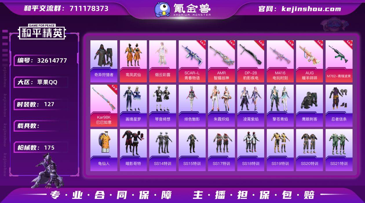 【938775】苹果 手Q-2粉装-8特效枪-0载具-3粉色飞行器-53501热力值-13王牌印记-127套装-175枪皮 【热门品类】:套装-奇异狩猎者,套装-忍者信条,套装-龟仙人,套装-暗影哥特 【粉色套装】:粉装-鸾凤武仙,角色-烟云彩露 【粉色枪皮等级】:SCAR-L-青春物语(七级),M416-电玩时刻(五级),AUG-暖羊咩咩(五级),M762-青锋波束(五级),Kar98K-巳巳如意(五级),Mk14-福马献瑞(五级),AMR-智耀战神(七级),DP-28-豹影疾电(五级) 【粉色枪皮】:SCAR-L-青春物语,M416-电玩时刻,AUG-暖羊咩咩,M762-青锋波束,Kar98K-巳巳如意,Mk14-福马献瑞,AMR-智耀战神,DP-28-豹影疾电 【粉色飞行器】:青春物语飞行器,千面幻镜飞行器,鎏金朋克飞行器 【粉色降落伞】:极限特训降落伞,百万伏特降落伞,至尊龙雀降落伞,环太平洋降落伞,绒雪飘舞降落伞,飒粉甜心降落伞,未来歌姬降落伞,圣堂之誓降落伞,夜幕颂歌降落伞,江南烟雨降落伞,精灵梦叶罗丽降落伞,星穹咏叹调降落伞,异瞳寒姬降落伞,炫彩糖果降落伞 【稀有套装】:套装-龟仙人,角色-奈斯,角色-罗莉,角色-X,套装-马上来财,套装-朱霞炽焰,套装-凌霄紫焰,套装-擎苍青焰,角色-绯色魅影,套装-画境星梦,套装-琴音绮想,...