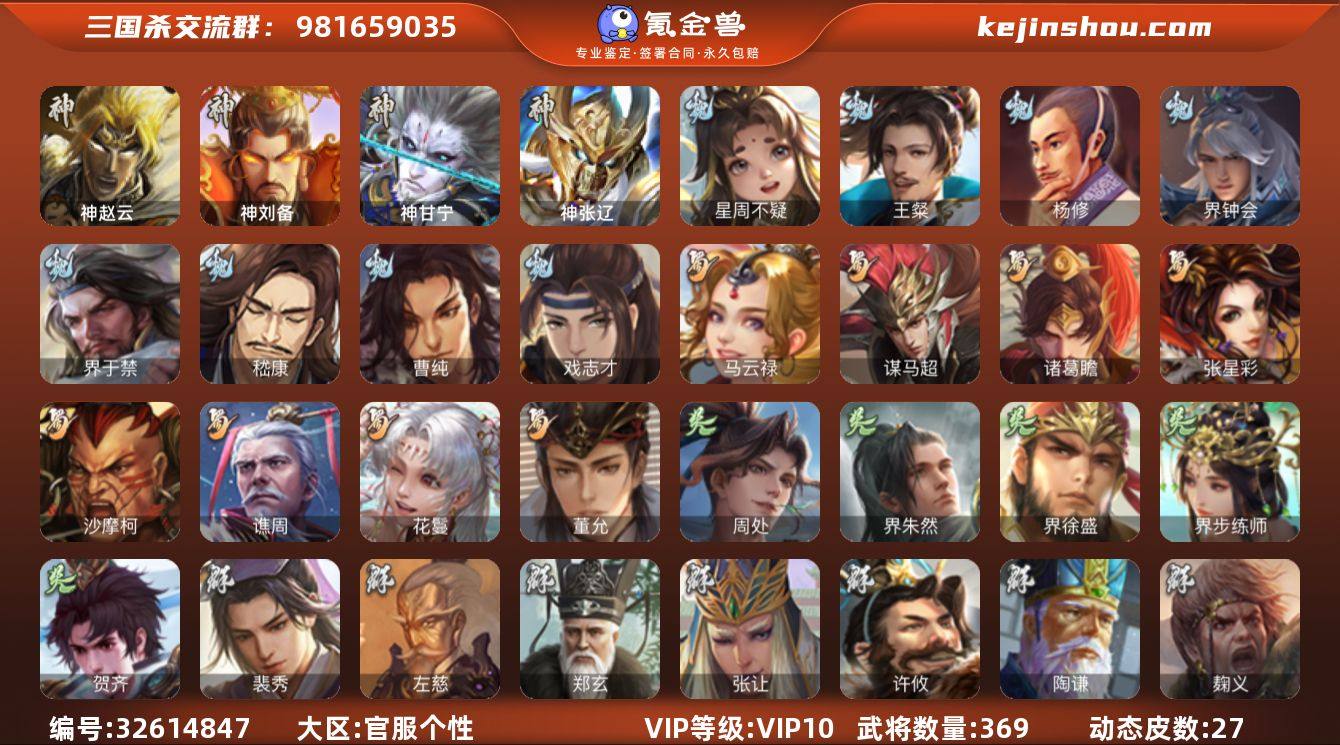 【2010】官阶:大将军;VIP等级:VIP10;史诗武将数量:39;动态皮肤数量:27;武将总数:369;史诗宝珠数量:0;将魂数量:8347;神将:6;魏国史诗武将:20;蜀国史诗武将:8;吴国史诗武将:5;群史诗武将:14 神赵云,神刘备,神甘宁,神张辽,神吕蒙,神周瑜,星周不疑,王粲,杨修,界钟会,界于禁,嵇康,曹纯,戏志才,马云騄,谋马超,诸葛瞻,张星彩,沙摩柯,谯周,花鬘,董允,周处,界朱然,界徐盛,界步练师,贺齐,裴秀,左慈,郑玄,张让,陶谦,麹义,南华老仙,祢衡,沮授,杜预,卑弥呼,张绣,李傕,许攸,神甘宁-万人辟易(动态),神诸葛亮-风舞魔鸟(动态),神赵云-战龙在野(动态),SP蔡文姬-兔年冬日(动态),郭嘉-十胜十败(动态),曹丕-牛年清明(动态),邓艾-神兵天降(动态),界郭嘉-十胜十败(动态),界曹丕-牛年清明(动态),界邓艾-神兵天降(动态),钟繇-稳定关右(动态),辛宪英-鼠年春节(动态),曹纯-虎年春节(动态),司马师-牛年中秋(动态),刘备-明良千古(动态),马超-牛年春节(动态),界刘备-明良千古(动态),界马超-牛年春节(动态),关银屏-兔年春节(动态),周处-义除三害(动态),周瑜-兔年七夕(动态),周瑜-免年清明(动态),黄盖-鏖战赤壁(动态),孙权-牛年七夕(动态),大乔-猪年七夕(动态),孙策-猪年七夕(动态),界黄盖-鏖战赤壁...