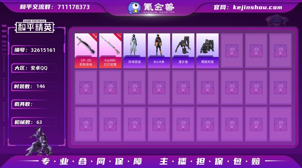 【特价出售】安卓Q-4特效枪3热门30套装63枪皮 14106热力值 历史英勇黄金Ⅴ 【4特效枪】 Kar98K-巳巳如意 (1级) DP-28-豹影疾电 (5级) Mk14-福马献瑞 (5级) AA12-G-萌骑幻想 (4级) 【3热门】 鹰眼刺客 漫步者 弄潮海豚