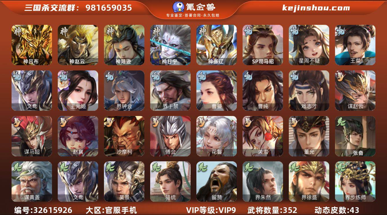 【2370】官阶:大将军;VIP等级:VIP9;史诗武将数量:49;动态皮肤数量:43;武将总数:352;史诗宝珠数量:0;将魂数量:2311;神将:7;魏国史诗武将:24;蜀国史诗武将:8;吴国史诗武将:8;群史诗武将:17
