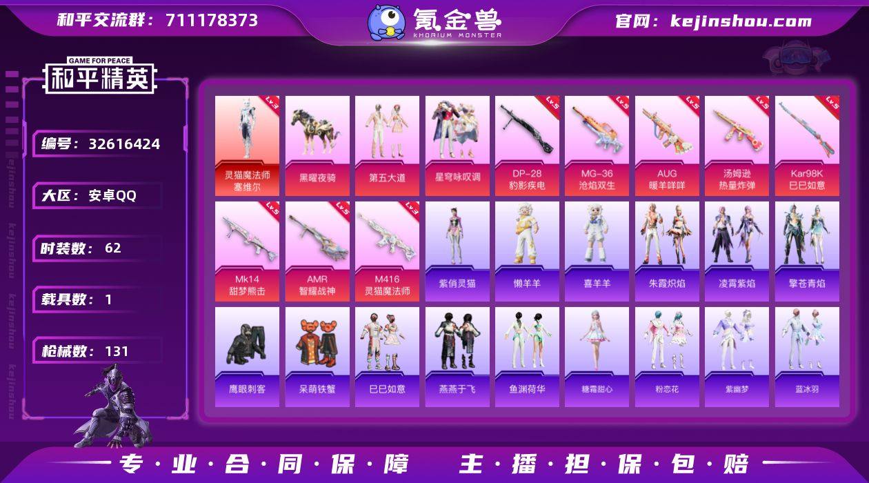 TD2632217无二次安卓 手Q-1神装-2粉装-10特效枪-1载具-2粉色飞行器-40295热力值-7王牌印记-62套装-131枪皮 【红色神装等级】:灵猫魔法师-塞维尔(三级) 【红色角色神装】:灵猫魔法师-塞维尔 【粉色套装】:粉装-第五大道,粉装-星穹咏叹调 【粉色枪皮等级】:M416-灵猫魔法师(三级),AUG-暖羊咩咩(五级),汤姆逊-热量炸弹(五级),Kar98K-巳巳如意(五级),Mk14-甜梦熊击(五级),Mk14-福马献瑞(五级),AMR-智耀战神(五级),AA12-G-萌骑幻想(二级),DP-28-豹影疾电(五级),MG-36-沧焰双生(五级) 【粉色载具】:黑曜夜骑 【粉色枪皮】:M416-灵猫魔法师,AUG-暖羊咩咩,汤姆逊-热量炸弹,Kar98K-巳巳如意,Mk14-甜梦熊击,Mk14-福马献瑞,AMR-智耀战神,AA12-G-萌骑幻想,DP-28-豹影疾电,MG-36-沧焰双生 【粉色飞行器】:炫彩糖果飞行器,灵猫魔法师飞行器 【粉色降落伞】:金蛇镇世降落伞,鬼刀降落伞,樱桃泡泡降落伞,戏水时光降落伞,智耀战神降落伞,星穹咏叹调降落伞,灵猫魔法师降落伞,绯穹魔姬降落伞,异瞳寒姬降落伞,炫彩糖果降落伞,鸢尾珑雾降落伞 【稀有套装】:套装-巳巳如意,套装-雪国风尚,套装-炫彩糖果,套装-马上来财,套装-燕燕于飞,套装-鱼渊荷华,角色...