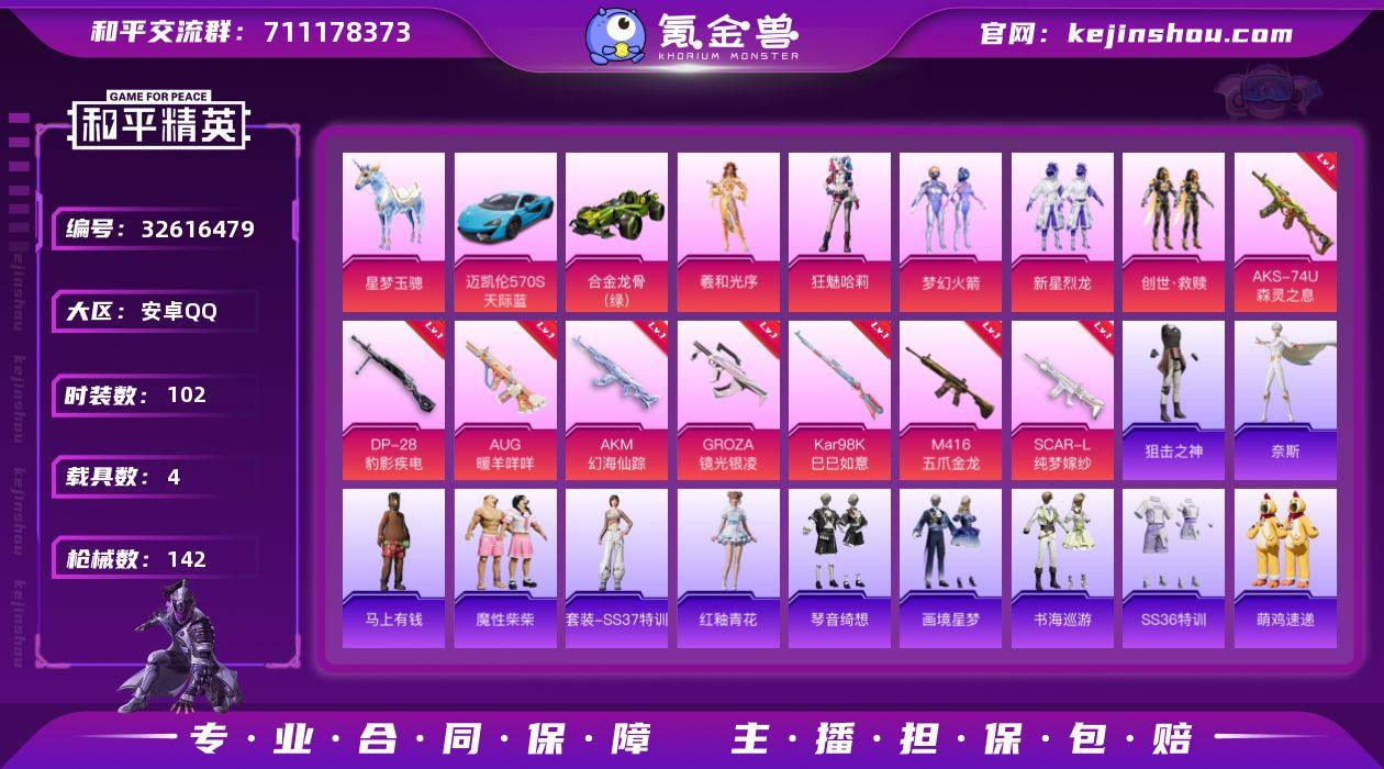 【小丑女4载具10特效枪5粉装 秒换绑不用等】 安卓Q区-47593热力值-102套装-142枪皮 【4载具】 玛莎拉蒂粉色 合金龙骨绿色 迈凯伦570S(天际蓝) 星梦玉骢【1稀有】 红眼罩【5粉装】 狂魅哈莉(小丑女) 梦幻火箭 新星烈龙 创世·救赎 角色-羲和光序【10特效枪】 M416-五爪金龙(6级) AKS-74U-森灵之息(4级) Mk14-福马献瑞(5级) ACE32-萌骑漫游(5级) SCAR-L-纯梦嫁纱(5级) AKM-幻海仙踪(5级) Kar98K-巳巳如意(4级) AUG-暖羊咩咩(3级) GROZA-镜光银凌(5级) DP-28-豹影疾电(4级)【144热门】 暗影哥特(红眼罩) 浪漫天命 金羽特工 忍者信条 狂沙舞者 SS27特训 SS26特训 SS25特训 SS24特训 SS23特训 Mini14-梦幻火箭 AKM-缤纷海域 AUG-幻影战神 SKS-糯团青竹 UMP45-炫光之旅 DBS-彩虹符号 M249-彩虹符号 MG3-幻世战舞者 呆萌铁蟹 鹰眼刺客 GROZA-彩虹符号 破蛋小黄鸡 长空猛禽 夏日倾情 燃烧卡路里 青涩时光 平底锅-五爪金龙 霓虹街区 妙红点点 懵萌河马 魅力单车 猎鹰 黎明保卫者 漫步者 黑色伏地魔 海岛探路者 纯真浪花 春日漫步 朱雀圣者 AA12-G-雨过天青 沙漠之鹰-雨过天青 平底锅-画境星梦 P90-紫矿核心 GROZA-紫矿核心 M16A4-雨过天青 MP5K-未来领航者 雨过天青 MG-36-薄荷星砂 GR...