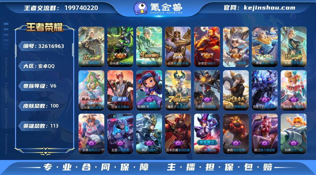 星元未来机甲 安卓Q-V6-永恒钻石III段位-113英雄-100皮肤-6传说-18史诗 【传说皮肤】:后羿神树通天,桑启鸣野蒿,李元芳飞鸢探春,后羿黄金射手座,孙尚香末日机甲,孙悟空地狱火 【限定皮肤】:狄仁杰阴阳师,赵云皇家上将,高渐离玩趣恶龙,典韦穷奇,狄仁杰魔术师,狄仁杰万华元夜,项羽海滩派对,程咬金演武夺筹,牛魔御旌,李元芳云中旅人,钟馗驱傩正仪,鬼谷子五谷丰年,沈梦溪大漠名商,狂铁御狮,米莱狄御霄,盾山御銮,鲁班大师探海日志,桑启海盐诗旅 【赛季限定】:典韦穷奇,狂铁御狮,米莱狄御霄,牛魔御旌,盾山御銮,狄仁杰万华元夜,程咬金演武夺筹,钟馗驱傩正仪,沈梦溪大漠名商,李元芳云中旅人,桑启海盐诗旅,鲁班大师探海日志,东皇太一噬灭天穹,钟馗虚灵犬护,甄姬逆浪荇歌 【战令限定】:周瑜线条小狗 【史诗皮肤】:周瑜线条小狗,女娲万灵启世,公孙离涂山容容,狂铁龙之律动,鬼谷子五谷丰年,狄仁杰鹰眼统帅,孙策猫狗日记,刘禅天才门将,百里守约特工魅影,亚瑟心灵战警,韩信白龙吟,吕布末日机甲,妲己魅力维加斯,孙尚香水果甜心,宫本武藏鬼剑武藏,廉颇地狱岩魂,狄仁杰魔术师,赵云皇家上将,鲁班七号电玩小子 【其他皮肤】:曹操逐霄...