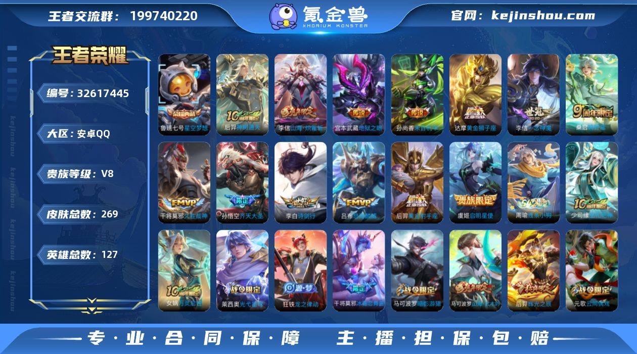 编号99454 不可二次 v8 269皮肤 1典藏 13传说 星空梦想 山海·炽霜斩 齐天大圣 龙胆 冰霜恋舞曲 如梦令(男) 辉光之辰 诗剑行 怒海麟威 启明星使 一念神魔 地狱之眼 黄金射手座 孙尚香-末日机甲 久胜战神 鸣野蒿 黄金狮子座 逐浪之夏 优雅恋人 玩趣恶龙 暗影游猎 云间偶戏 冰冠公主 街头霸王 暗夜猫娘 黄金分割率 乱世虎臣 李小龙 特工魅影 天秀·启明 猫狗日记(男) 曙光守