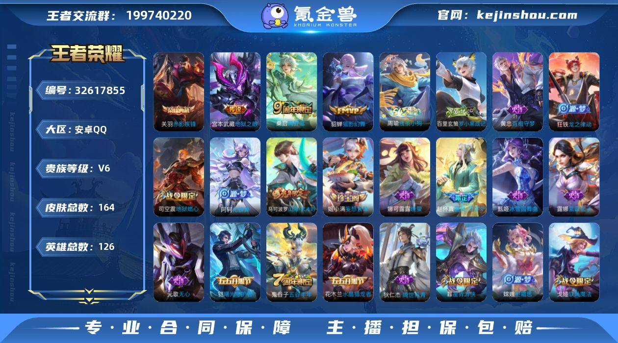 无二次-安卓Q-V6-永恒钻石II段位-126英雄-164皮肤-1典藏皮肤-3传说-56史诗 【英雄全皮】:戈娅全皮 【荣耀典藏】:关羽赤影疾锋 【传说皮肤】:桑启鸣野蒿,貂蝉猫影幻舞,宫本武藏地狱之眼 【限定皮肤】:姜子牙天穹之誓,狄仁杰阴阳师,赵云皇家上将,孙尚香蔷薇恋人,庄周玄嵩,元歌无心,马可波罗山海玄木吟,狄仁杰魔术师,项羽海滩派对,李元芳云中旅人,鬼谷子五谷丰年,裴擒虎擒涛扼浪,云中君纤云弄巧,上官婉儿梁祝,嫦娥拒霜思,嫦娥暖冬兔眠,西施玲珑珍味,鲁班大师探海日志,桑启海盐诗旅,暃星界游侠,戈娅驭风魔法,艾琳流音漫舞,司空震地狱燃心,阿古朵江河有灵,张良古海寻踪,蒙犽百解令,蒙恬荣光圣徽,鬼谷子天穹祈灯,姬小满妄想食味,沈梦溪龙舞盛年,刘邦剑破天穹 【年限皮肤】:庄周玄嵩,马可波罗山海玄木吟 【赛季限定】:李元芳云中旅人,桑启海盐诗旅,裴擒虎擒涛扼浪,鲁班大师探海日志,张良古海寻踪,鬼谷子天穹祈灯,刘邦剑破天穹,姜子牙天穹之誓,太乙真人谧流熔炉,钟馗虚灵犬护,亚瑟荣光之誓,蒙恬荣光圣徽 【战令限定】:暃星界游侠,嫦娥暖冬兔眠,戈娅驭风魔法,西施玲珑珍味,司空震地狱燃心,艾琳流音漫舞,孙膑茶境仙,马超访茗...