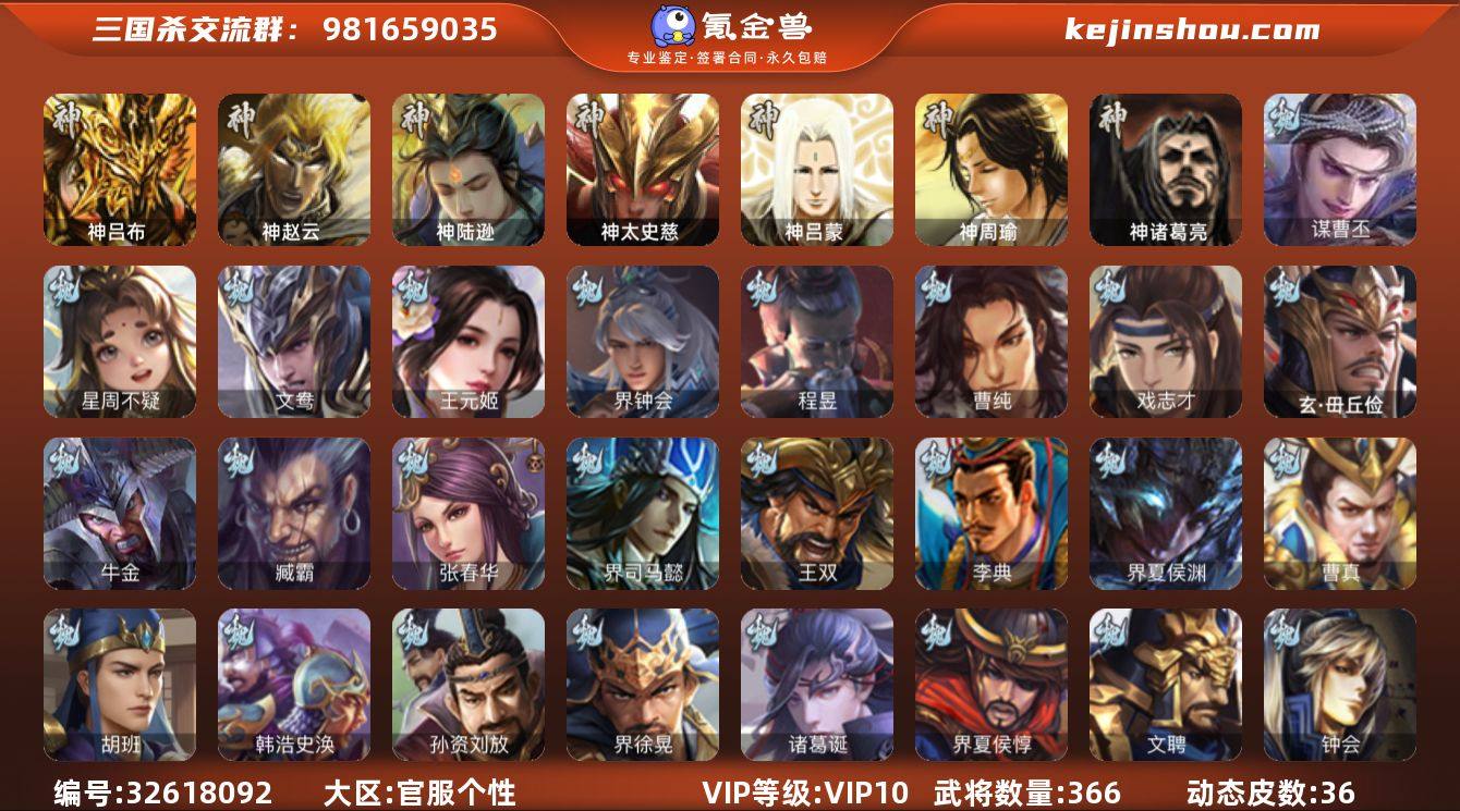 【2707】官阶:大将军;VIP等级:VIP10;史诗武将数量:34;动态皮肤数量:36;武将总数:366;史诗宝珠数量:0;将魂数量:7407;神将:5;魏国史诗武将:20;蜀国史诗武将:9;吴国史诗武将:6;群史诗武将:9