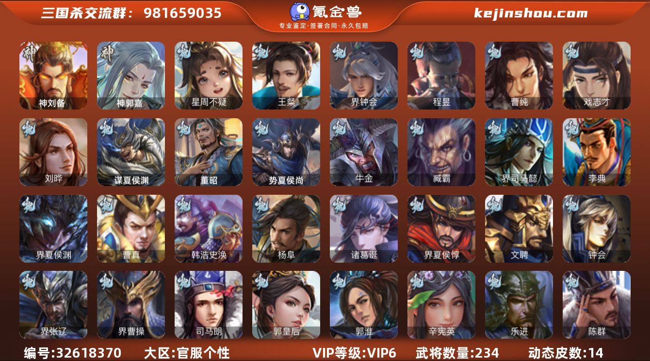 神刘备,神郭嘉,星周不疑,王粲,界钟会,曹纯,戏志才,刘晔,程昱,关索,界黄忠,左慈,谋吕布,兀突骨,势夏侯尚,SP关羽,乐进,曹昂,诸葛诞,朱灵,文聘,SP姜维,钟会,曹冲,郭淮,满宠,界曹操,界司马懿,界夏侯惇,界张辽,界郭嘉,李典,曹真,韩浩史涣,陈群,曹叡,曹休,钟繇,司马朗,郭皇后,辛宪英,吕虔,杜畿,界曹植,蔡贞姬,杨阜,阮慧,司马孚,谋夏侯渊,牛金,界夏侯渊,臧霸,董昭,SP孙尚香,关银屏,夏侯霸,马良,关兴张苞,廖化,界马岱,关平,简雍,刘封,界法正,界关兴张苞,界刘备,界关羽,界赵云,界马超,SP徐庶,吴懿,周仓,张松,黄皓,严颜,界伊籍,界卧龙诸葛,界庞统,胡金定,张翼,邓芝,傅肜,糜夫人,界周仓,刘巴,谋庞统,界张嶷,吴班,霍峻,诸葛果,甘夫人,吴珂,鲁肃,凌操,诸葛恪,诸葛瑾,孙鲁育,程普,韩当,潘璋马忠,虞翻,朱然,界甘宁,界吕蒙,界黄盖,界周瑜,界大乔,界陆逊,孙鲁班,朱桓,顾雍,朱治,全琮,界张昭张纮,界韩当,孙邵,桥公,陈武董袭,蒋钦,谋小乔,友庞统,伏完,界袁术,SP赵云,张宝,伏皇后,李儒,华雄,袁术,界...