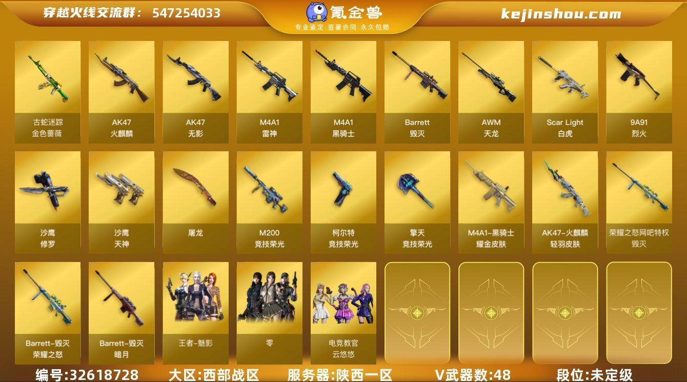 陕西一区-53V-9王者武器数-2炫金武器数 【热门武器】:Scar Light-白虎,金色蔷薇-古蛇迷踪,修罗-古蛇迷踪,M200-竞技荣光,M4A1-黑骑士,裁决-雪莉杨,沙鹰-修罗*2 【王者炫金武器】:高爆手雷-雷霆王者*4,炫金骑士*2 【音效卡】:M4A1-黑龙音效卡,M4A1-黑骑士音效卡 【皮肤】:Scar Light-白虎-暗星,雷神-荣耀之魄,雷神-维纳斯皮肤,雷神-源计划2.0专属 皮肤,雷神-化蛇 皮肤,火麒麟-轻羽皮肤,毁灭-暗月,毁灭-荣耀之怒,毁灭-百城浙江 皮肤,黑骑士耀金皮肤,黑骑士-破浪10年皮肤,黑骑士-破界 皮肤,修罗-星空 【角色】:魅影,电竞教官-云悠悠,零·纪元,蛇隐宗,乔伊教练,云海玲珑,暗夜-X,电竞少女,芳心审判者,娟娟,兰-海滩派对,兰-新年限定,0号玩家,零-水下丽影,灵狐者-X,灵狐者-黄金海岸,龙儿,龙儿-小淘气,曼陀罗-X,玫瑰花神,蛇姬,斯沃特-X,兔囡囡,新娜塔莎,影武者-X,潘多拉-N 【人偶武器】:裁决-雪莉杨,AWM-灵狐-15周年嘉年华,生化手雷-机甲核心*2 【暴走生化】:超级对讲机 【挑战大师】:激光毁灭者III 【英雄级武器】:AK47-火麒麟,M4A1-雷神,M4A1-黑骑士,AK47-无影,Scar Light-白虎,金色蔷薇-古蛇迷踪,9A91-烈火,机械迷城...