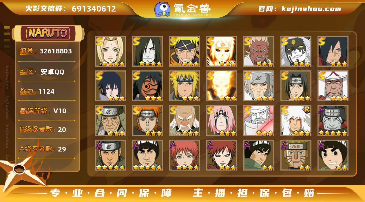 (可免费转为苹果)V10 20S 29A 1124万战力 4000金币 热门A忍战天天、新春止水、漂泊六道、漂泊小南。仙人自来也78片 创立柱间90片 YY1749 【S级忍者】:猿飞日斩「秽土转生」(3星),千手扉间「秽土转生」(3星),宇智波斑「秽土转生·解」(3星),大野木「忍界大战」(3星),春野樱「忍界大战」(3星),艾「忍界大战」(3星),宇智波鼬「须佐能乎」(3星),自来也「舞之豪杰」(3星),大蛇丸(4星),纲手(4星),猿飞日斩(3星),波风水门(3星),神秘面具男「红夜之刃」(3星),漩涡鸣人「九喇嘛连结」(3星),佩恩「天道」(3星),宇智波佐助「永恒万花筒」(3星),大筒木金式(3星),大筒木桃式(3星),波风水门「九喇嘛连结」(3星),漩涡鸣人·宇智波佐助(3星) 【A级忍者】:艾「青年」(2星),长门「青年」(2星),波风水门「青年」(2星),迪达拉(2星),大蛇丸「晓」(2星),飞段(2星),飞段「死司凭血」(2星),干柿鬼鲛(5星),漩涡博人「桃式显现」(2星),漩涡鸣人「仙人模式」(2星),机械鸣人「初始形态」(2星),迈特凯(5星),我爱罗「疾风传」(3星),蝎(4星),小南「漂泊浪客」(2星),猿飞阿斯玛(5星),宇智波止水「新春限定」(2星),宇智波鼬(2星),宇智波佐助「须佐能乎」(2星),宇智波佐助...