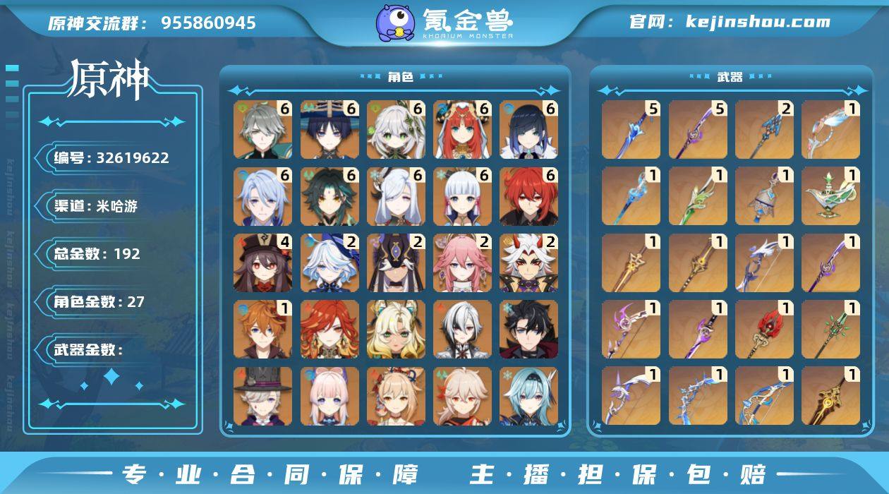192黄 风元素:6命流浪者, 0命枫原万叶, 6命魈, 0命温迪 火元素:0命玛薇卡, 0命阿蕾奇诺, 0命林尼, 0命宵宫, 4命胡桃, 0命可莉 水元素:2命芙宁娜, 6命夜兰, 6命妮露, 6命神里绫人, 0命珊瑚宫心海, 1命达达利亚, 0命希格雯 雷元素:2命赛诺, 2命八重神子, 6命雷电将军 冰元素:6命神里绫华, 0命莱欧斯利, 6命申鹤, 0命甘雨, 0命优菈, 0命爱可菲 岩元素:0命希诺宁, 0命钟离, 2命荒泷一斗, 0命阿贝多 草元素:6命纳西妲, 6命艾尔海森 【常驻五星角色及命座】 风元素:5命琴 火元素:6命迪卢克, 4命迪希雅 水元素:2命莫娜 雷元素:6命刻晴 冰元素:6命七七 草元素:6命提纳里 单手剑:精1圣显之钥, 精1天空之刃, 精1天空之刃, 精5波乱月白经津, 精1磐岩结绿, 精1裁叶萃光, 精1雾切之回光, 精1雾切之回光, 精1静水流涌之辉, 精1风鹰剑, 精1风鹰剑 双手剑:精1狼的末路, 精1苇海信标, 精1赤角石溃杵 长柄武器:精1和璞鸢, 精1天空之脊, 精2息灾, 精1护摩之杖, 精5薙草之稻光, 精1薙草之稻光, 精1赤沙之杖, 精1赤沙之杖 法器:精1千夜浮梦, 精1四风原典, 精1四风原典, 精1四风原典, 精1图莱杜拉的回忆, 精1天空之卷, 精1神乐之真意 弓:精1冬极白星, 精1天空之翼, 精1白雨心...
