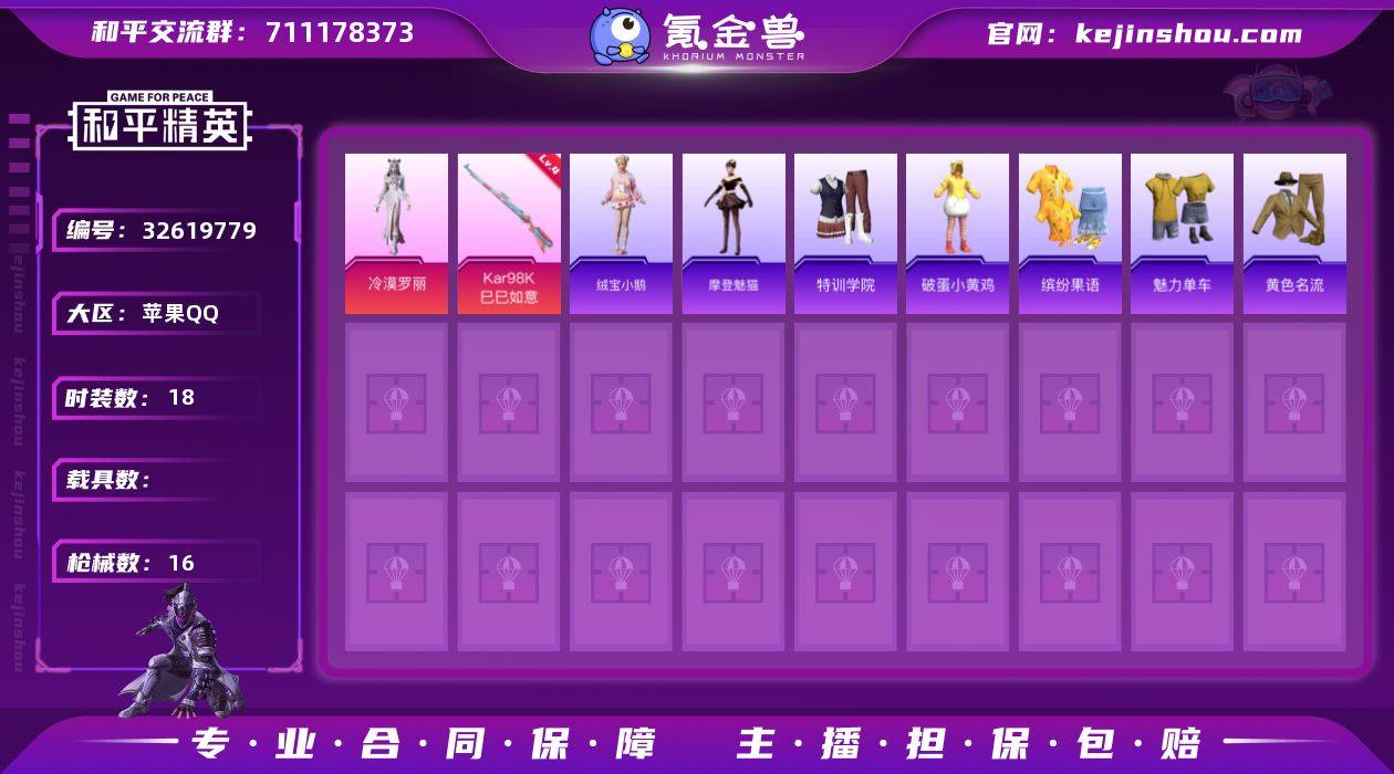 苹果 手Q-1粉装-1特效枪-0载具-0粉色飞行器-5300热力值-2王牌印记-18套装-16枪皮 TD2512604 【粉色套装】:角色-冷漠罗丽 【粉色枪皮等级】:Kar98K-巳巳如意(四级) 【粉色枪皮】:Kar98K-巳巳如意 【粉色降落伞】:智耀战神降落伞 【稀有套装】:套装-绒宝小鹅,套装-雪国风尚,角色-摩登魅猫 【稀有枪皮】:QBZ-彩虹符号,M762-天降萌叽,Vector-生命誓言,SKS-炫彩节奏,S12K-智耀战神,撬棍-冷漠罗丽 【其他套装】:套装-特训学院,套装-破蛋小黄鸡,套装-缤纷果语,套装-魅力单车,套装-黄色名流 【营地ID】:1029850686