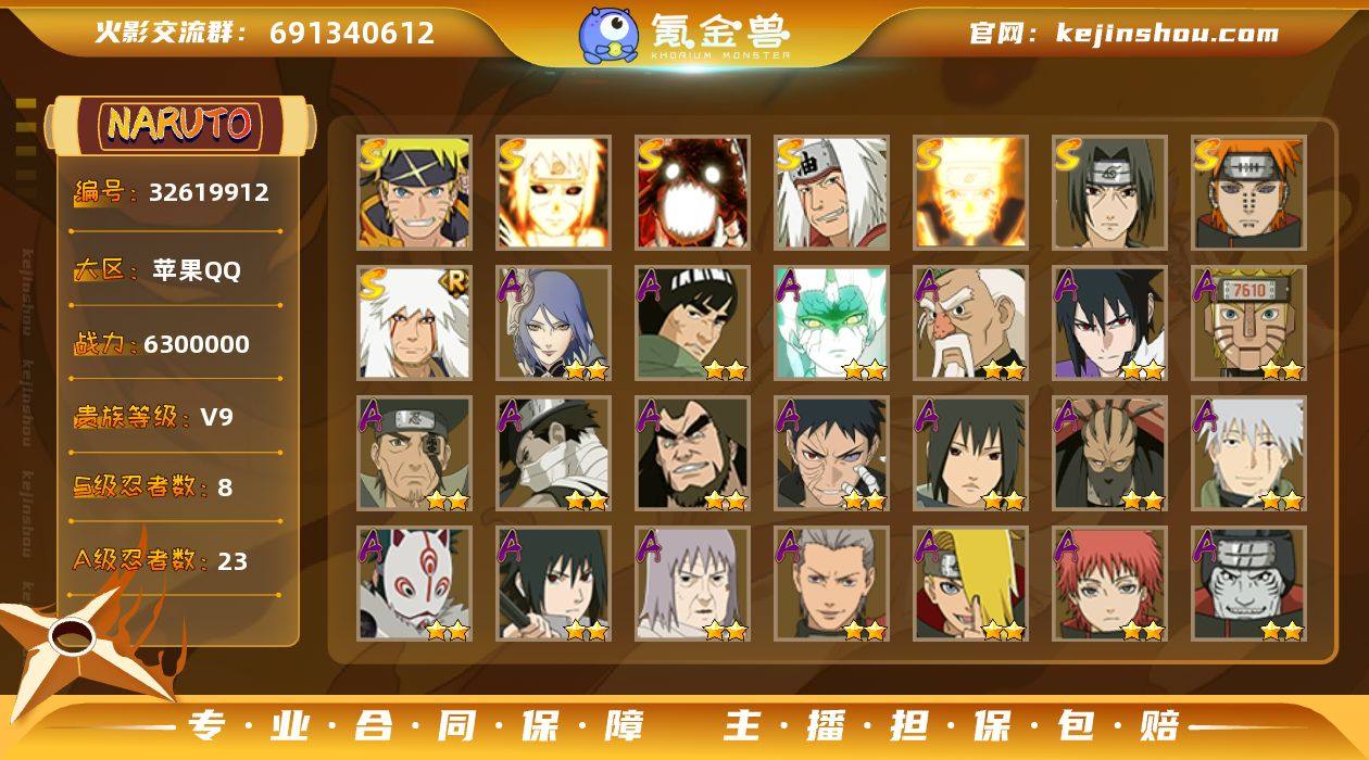 实名: 可修改 贵族等级: V9 S忍数: 8 A忍数: 23 战力值(万): 630 S级忍者: 佩恩「天道」,宇智波鼬 「须佐能乎」,自来也 「舞之豪杰」,漩涡鸣人 「九喇嘛连结」,自来也 「传说中的三忍」,漩涡鸣人 「暴怒·第六尾」,波风水门「九喇嘛连结」,漩涡鸣人·宇智波佐助