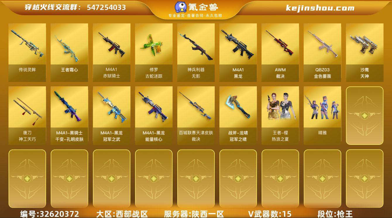 【ky5750】陕西一区-17V-2王者武器数-0炫金武器数 【传说武器】:传说灵眸 【热门武器】:传说灵眸,QBZ03-金色蔷薇,修罗-古蛇迷踪,羊驼玩偶 【王者炫金武器】:王者霜心 【皮肤】:AWM-裁决-百城联赛天津皮肤,M4A1-千变-孔明皮肤,黑龙-能量核心,黑龙-冠军之武,龙啸-冠军之啸 【角色】:晴雅,王者樱-热浪之夏,蛇隐宗,乔伊教练,芳心审判者,风暴女,嘉年华灵狐,娟娟,灵狐者-X,麻雀,潘多拉-X,潘多拉-甜心教官,蛇姬,兔囡囡 【人偶武器】:AWM-灵狐-15周年嘉年华,迷你波特博士,夺魂,迷你火种,深渊终结者手雷*2,迷你巨石泰坦-魔花研究所 【暴走生化】:超级对讲机 【挑战大师】:冰龙粉碎者-白马银枪,激光毁灭者III-白马银枪,神圣爆裂者-末日III 【英雄级武器】:M4A1-黑龙,无影-神兵利器,QBZ03-金色蔷薇,AWM-裁决,沙鹰-天神,修罗-古蛇迷踪,唐刀-神工天巧,高爆手雷-神工天巧*2,高爆手雷-古蛇迷踪,闪光弹-神工天巧,烟雾弹-神工天巧,烟雾弹-古蛇迷踪,M4A1-赤狱骑士 【道具】:BS战队炫彩背包,云山科技背包,亚洲杯纪念炫彩背包,全能枪王背包,古蛇迷踪炫彩背包,次元之矛-黄金背包,老虎背包,超级背包,女皇终结者-魔龙之吻,救世主-黑桃战神...