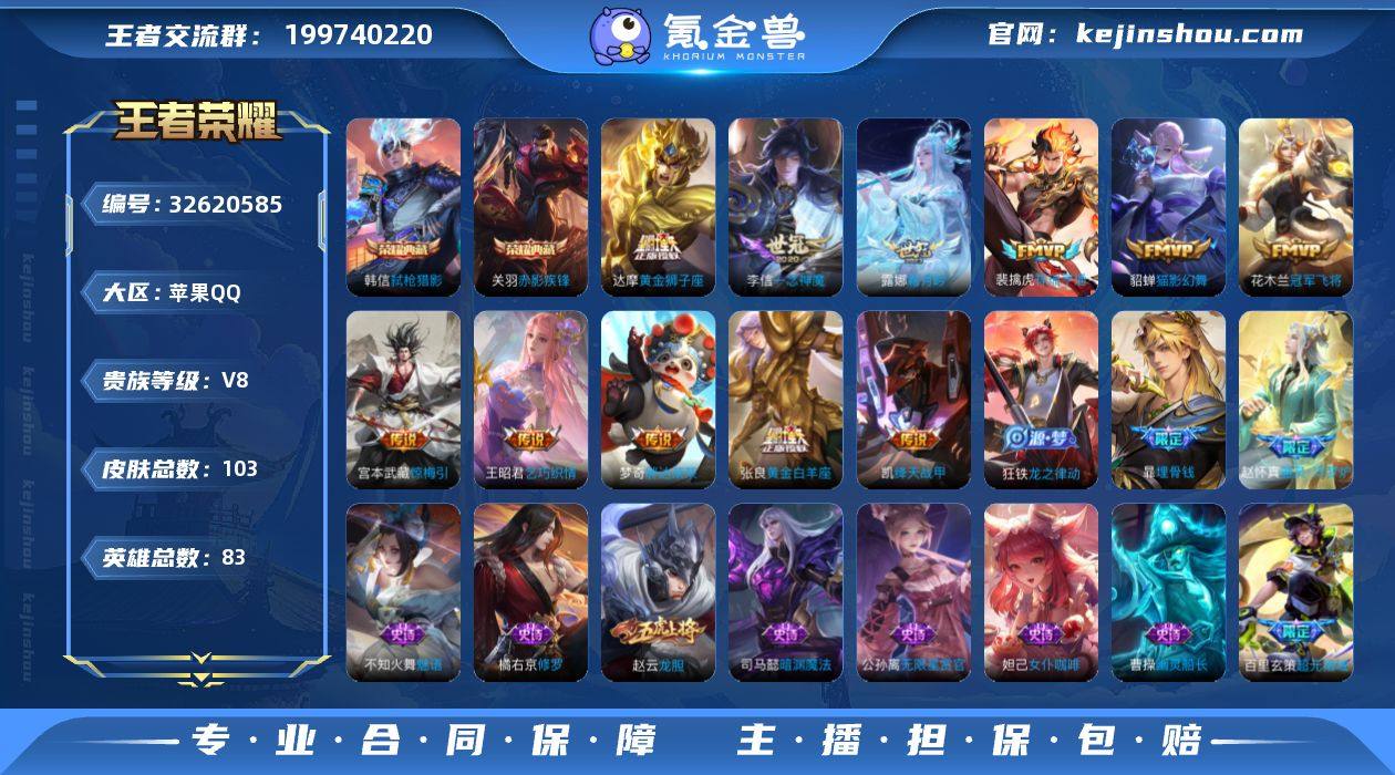 V8 2典藏 2无双 18传说 83英雄 103皮肤 可修改实名 男号 【英雄全皮】敖隐全皮,孙权全皮,蚩奼全皮,大禹全皮 【稀有英雄】敖隐(小龙人),大司命,嬴政(始皇帝),橘右京(橘子),娜可露露(鸟人),不知火舞,赵云 【荣耀水晶】弑枪猎影(韩信典藏),赤影疾锋 【无双皮】问心剑,无相 【传说皮】异界灵契-花木兰,神骥·越千峰,典韦战鼓燎原,万灵伏威,祥瑞亨通,黄金狮子座,黄金白羊座,末日机甲-孙尚香(绿蚂蚱),一念神魔,冠军飞将,猫影幻舞,胖达荣荣,乞巧织情,绛天战甲(鸡嘴战神),惊梅引,霜月吟 【史诗皮】超元猎域,芈月浮光幕影,埋骨钱,器灵·浮梦炉,春霖将至,撼世英歌,线条小狗-周瑜,线条小狗-小乔,傩神司,光弋星穹,龙之律动,遇见神鹿,紫霞仙子,千年之狐,匿光侦查者,完美假期,无限星赏官,偶像歌手,魅语,白蛇,节奏热浪,修罗,女仆咖啡,水果甜心,天才门将,功夫厨神,德古拉伯爵,幽灵船长,暗渊魔法,天秀·启明,乘风破浪,圣诞狂欢,鹰眼统帅,雪上飞焰,无心,未来纪元-赵云 【限定皮】怒海麟威,龙胆,热情桑巴 【普通皮】赤刃凌霄,星梦巡礼,暗都幽影,荣光之誓,往忆晖光,径山谋武,溯影追猎,糖果风暴,苍云破阵,线条小狗-妲己,班班快跑,极光幻客,零食大作战,五福同心,花好人间,海滩派对,皇家上将,魔术师,启...