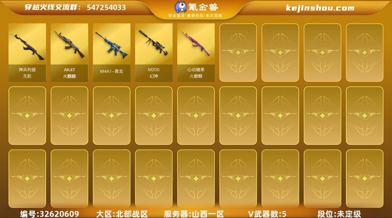 山西一区-5V-0王者武器数-0炫金武器数 【热门武器】:M4A1-青龙,M200-幻神 【皮肤】:火麒麟-心动糖果 【角色】:嘉年华灵狐,灵狐者-X,曼陀罗-X,潘多拉-X,斯沃特-X 【人偶武器】:AWM-灵狐-15周年嘉年华 【暴走生化】:超级对讲机 【挑战大师】:神圣爆裂者-末日III 【英雄级武器】:AK47-火麒麟,M4A1-青龙,无影-神兵利器,M200-幻神,高爆手雷-云龙 【源级武器】:QBZ03-文殊坊,AWM-裁决-百城联赛天津,魂·裁决-凤灵,魂·屠龙-都是Cfer 【道具】:超级背包,夺命之镰,防化服,金色流光-枪王排位*2,枪王排位28赛季金色流光,枪王排位29赛季金色流光,防弹头盔*4,防弹衣*4,C4工具钳*4,手雷包*4 【特殊枪械】: