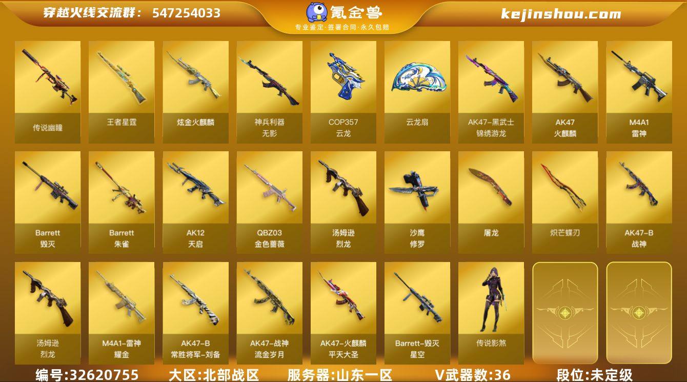 山东一区-42V-3王者武器数-1炫金武器数 【传说武器】:传说幽瞳 【传说角色】:传说影煞 【热门武器】:传说幽瞳,QBZ03-金色蔷薇,汤姆逊-烈龙*4,COP-白鲨,沙鹰-修罗,炽芒蝶刃 【王者炫金武器】:王者星霆,炫金火麒麟 【皮肤】:雷神-耀金皮肤,火麒麟-平天大圣,毁灭-星空,毁灭-英雄计划 皮肤,战神-流金岁月皮肤,AK47-B-常胜将军-刘备 【角色】:奇洋探员,乔伊教练,修道士,云海玲珑,幻面灵狐,飞虎队-X,嘉年华灵狐,兰-新年限定,龙儿,曼陀罗-礼服,潘多拉-X,潜龙队-X,青霞仙子,蛇姬,斯沃特-X,蜀雪,兔囡囡,新娜塔莎,游珑儿,团团 【人偶武器】:COP-白鲨,Scar Light-马枪,AWM-灵狐-15周年嘉年华*2,夺魂,迷你牛牛,迷你生化手雷*2,迷你超能女侍 【挑战大师】:AK47-冰龙粉碎者*2 【英雄级武器】:AK47-火麒麟,M4A1-雷神,AK12-天启,无影-神兵利器,黑武士-锦绣游龙,QBZ03-金色蔷薇,AK47-B-战神,HK417-朱雀-电竞之星,机械迷城-穹宇,天罚-斗烈龙驹,Barrett-毁灭,Barrett-朱雀,汤姆逊-烈龙*4,沙鹰-修罗,柯尔特-电竞之星,COP 357-云龙,屠龙,炽芒蝶刃,屠龙-电竞之星,屠龙-斗烈龙驹,龙啸-烈火龙威*2,云龙扇,高爆手雷-竞技荣光,高爆...