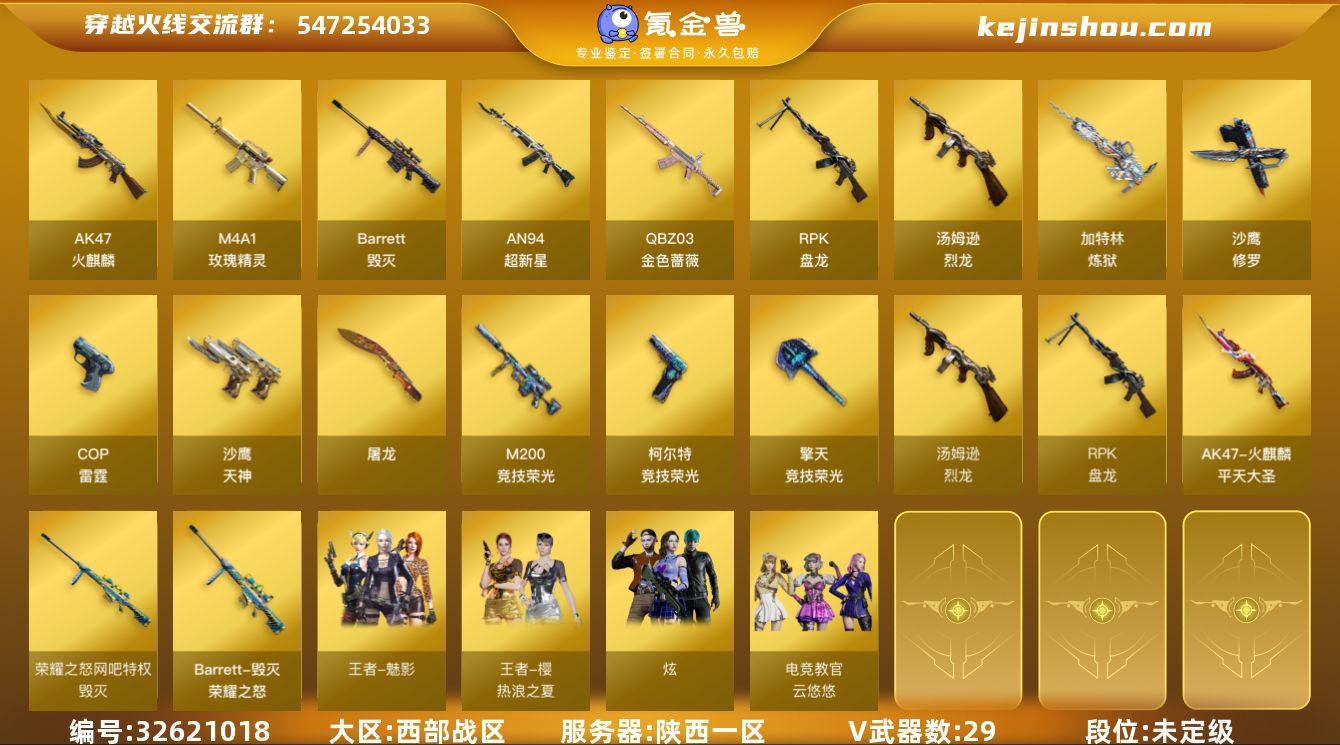 陕西一区-33V-1王者-0炫金 【热门武器】:QBZ03-金色蔷薇,M200-竞技荣光,汤姆逊-烈龙,RPK-盘龙,加特林-炼狱,沙鹰-修罗*2 【音效卡】:Barrett-毁灭音效卡,Barrett-碧霄极光音效卡 【皮肤】:雷神-宇航兔皮肤,雷神-神秘按键 皮肤,火麒麟-平天大圣,火麒麟-心动糖果,毁灭-荣耀之怒,毁灭-英雄计划 皮肤 【角色】:樱,魅影,电竞教官-云悠悠,战地猎狐,奇洋探员,乔伊教练,修道士,云海玲珑,芳心审判者,风暴女,嘉年华灵狐,灵狐者-X,灵狐者-黄金海岸,灵狐者-七夕宝贝,萌儿,潘多拉-X,斯沃特-X 【人偶武器】:AWM-灵狐-15周年嘉年华,生化手雷-机甲核心*2,迷你超能女侍 【暴走生化】:超级对讲机 【挑战大师】:神圣爆裂者III,激光毁灭者III-白马银枪,VEPR-12-金魔,激光毁灭者III,机甲撕裂者III,试炼破坏者III,神圣爆裂者-末日III,阐释者III 【英雄级武器】:AK47-火麒麟,AN94-超新星,M4A1-玫瑰精灵,QBZ03-金色蔷薇,Barrett-毁灭,M200-竞技荣光,王者之力-觉醒版,RPK-盘龙,加特林-炼狱,汤姆逊-烈龙,沙鹰-修罗*2,沙鹰-天神,COP-雷霆,柯尔特-竞技荣光,屠龙*3,擎天-竞技荣光,高爆手雷-竞技荣光,闪光弹-竞技荣光,烟雾弹-竞技荣光,烟雾弹...