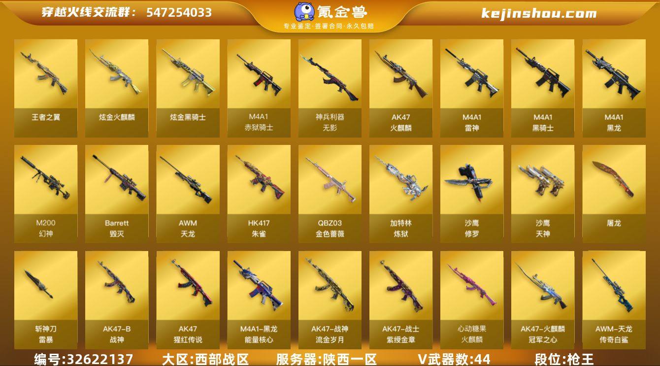 【ky5751】陕西一区-45V-1王者武器数-2炫金武器数 【热门武器】:QBZ03-金色蔷薇,HK417-朱雀,M4A1-青龙,M200-幻神,M4A1-黑骑士,加特林-炼狱,斯泰尔-蝴蝶,USP-雷暴,沙鹰-修罗*2 【王者炫金武器】:王者之翼,炫金火麒麟,炫金骑士 【音效卡】:M4A1-黑龙音效卡,M4A1-黑骑士音效卡,Barrett-毁灭音效卡 【皮肤】:雷神-荣耀之魄,雷神-冠军之魄,火麒麟-冠军之心,火麒麟-心动糖果,毁灭耀金皮肤,毁灭-黑大圣皮肤,黑龙-能量核心,战神-紫绶金章皮肤*5,战神-流金岁月皮肤*2,天龙-能量核心,AWM-天龙-传奇70KG,AWM-天龙-传奇白鲨,修罗-能量核心 【角色】:零,王者-瞳-闭月羞花,王者玲珑-小乔,乔伊教练,暗夜-X,虎妞,嘉年华灵狐,灵狐者-黄金海岸,龙儿,麻雀,曼陀罗-X,潘多拉-X,潘多拉-甜心教官,潜龙队-X,青霞仙子,斯沃特-X,铁骑荣耀,维纳斯,新娜塔莎,智影 【人偶武器】:斯泰尔-蝴蝶,AWM-灵狐-15周年嘉年华,闪光弹-小乔*2 【暴走生化】:黑龙吞噬者 【英雄级武器】:AK47-火麒麟*2,M4A1-黑龙,M4A1-雷神*2,M4A1-黑骑士,M4A1-青龙,HK417-朱雀,无影-神兵利器,QBZ03-金色蔷薇,AK-47-猩红传说*6,AK47-B-战神,AWM-天龙,Barrett-毁灭*2,M20...