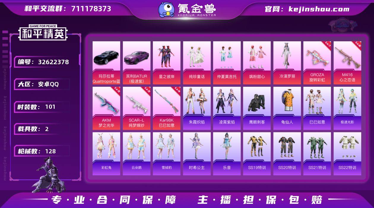 安卓 手Q-5粉装-5特效枪-2载具-2粉色飞行器-42271热力值-10王牌印记-101套装-128枪皮 【热门品类】:套装-龟仙人 【粉色套装】:粉装-星之彼岸,粉装-纯珍童话,粉装-仲夏莫吉托,粉装-飒粉甜心,角色-冷漠罗丽 【粉色枪皮等级】:AKM-梦之光华(五级),SCAR-L-纯梦嫁纱(五级),M416-心之恋语(六级),GROZA-旋转彩虹(七级),Kar98K-巳巳如意(四级) 【粉色载具】:玛莎拉蒂Quattroporte(夜幕蓝),宾利BATUR(极速紫) 【粉色枪皮】:AKM-梦之光华,SCAR-L-纯梦嫁纱,M416-心之恋语,GROZA-旋转彩虹,Kar98K-巳巳如意 【粉色飞行器】:纯梦嫁纱飞行翼,终晖之翼飞行器 【粉色降落伞】:旋转彩虹降落伞,暗夜鎏金降落伞,仲夏莫吉托降落伞,飒粉甜心降落伞,天星战神降落伞,江南烟雨降落伞,智耀战神降落伞,最终圣卫者降落伞 【稀有套装】:套装-龟仙人,套装-巳巳如意,套装-极速光影,套装-彩虹兔,套装-云朵鹅,套装-雪绒豹,角色-时希公主,角色-乐音,套装-朱霞炽焰,套装-凌霄紫焰 【稀有枪皮】:AKM-夜灯,AKM-彩虹符号,AKM-破晓战魂,M16A4-幻世战舞者,M16A4-生命誓言,SCAR-L-炫彩节奏,SCAR-L-玉兔迎春,M416-暗夜行者,M416-糯团青竹,M416-蓝色火焰,GROZA-影袭...