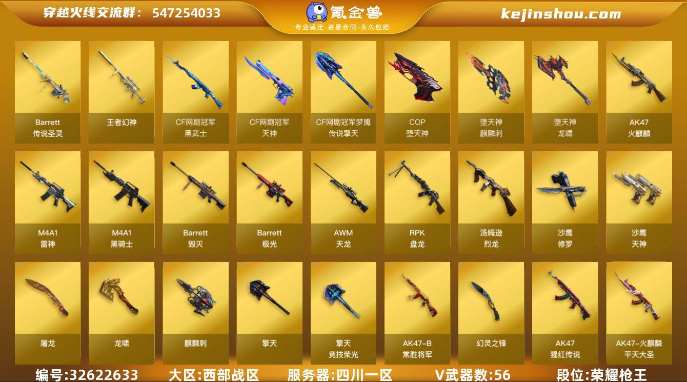 【ky5888】四川一区-58V-7王者-0炫金 【传说武器】:传说圣灵 【热门武器】:传说圣灵,王者幻神,死亡之眼,牛牛-AK47,M4A1-黑骑士,汤姆逊-烈龙*6,RPK-盘龙,COP-堕天神,沙鹰-修罗 【王者炫金武器】:王者幻神 【音效卡】:M4A1-雷神音效卡,M4A1-黑骑士音效卡 【稀有皮肤】:雷神-荣耀之魄,火麒麟-平天大圣,毁灭耀金皮肤,屠龙-荣耀之锋 【角色】:王者玲珑,零,迷迭香,职业选手 【人偶武器】:巴雷特-零-水下丽影,AWM-灵狐-15周年嘉年华,牛牛-AK47,闪光弹-貂蝉,高爆手雷-大乔 【暴走生化】:死亡之眼 【挑战大师】:神圣爆裂者-末日III,激光毁灭者III-白马银枪 【英雄级武器】:擎天-竞技荣光,幻灵之锋,COP-堕天神,麒麟刺-堕天神*2,龙啸-堕天神*3,黑武士-CF网剧冠军*2,天神-CF网剧冠军*2,擎天-CF网剧冠军*2,手雷-动感闪耀,M4A1-雷神,M4A1-黑骑士,RPK-盘龙,汤姆逊-烈龙*6,AK47-火麒麟,AWM-天龙,Barrett-毁灭,Barrett-极光,AK-47-猩红传说,AK47-B-常胜将军,沙鹰-天神*2,沙鹰-修罗,麒麟刺,擎天,龙啸,屠龙 【特殊枪械】:1黑骑士,6烈龙,1盘龙