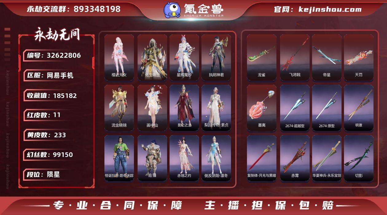 永劫无间PC端成品号,LV326,资产分18万+,皮肤超多,神品、极品、龙之道、夏日派对都有,时装段位藏雨熟客III阶,资源很全,账号安全,支持全平台互通,直接上号玩没问题~ 账号里有龙雀、画中仙、星辉魔纱、流金晓锦、帝星、飞将戟、执明神君、化生明王、天罚、调星·西溟重岳等神品皮肤,龙之道、极品皮肤也全,喜欢收集的别错过! 账号没被封,数据可转移,细节图,价格好聊,诚心要可小刀,喜欢直接拍,随时聊~