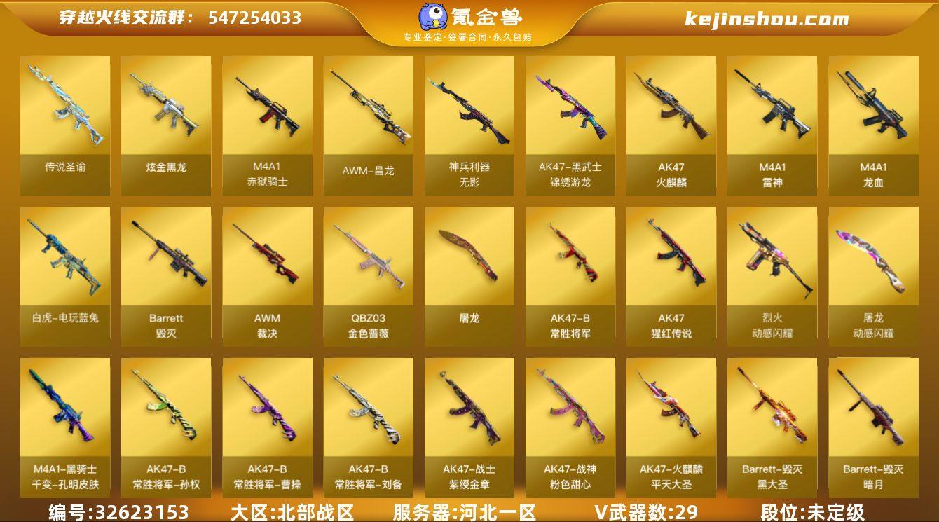 河北一区-36V-1王者武器数-1炫金武器数 【传说武器】:传说圣谕 【热门武器】:传说圣谕,QBZ03-金色蔷薇,死亡之眼,白虎-电玩蓝兔 【王者炫金武器】:炫金黑龙 【音效卡】:Barrett-碧霄极光音效卡,炼狱-百战金芒-庆典舞曲音效卡,柯尔特-百战金芒-庆典舞曲音效卡 【皮肤】:裁决-叶芒苍灵 皮肤,M4A1-再燃火线,雷神-神秘按键 皮肤,火麒麟-平天大圣,毁灭-暗月,毁灭-黑大圣皮肤,毁灭-英雄计划 皮肤,M4A1-千变-孔明皮肤,战神-粉色甜心皮肤,战神-紫绶金章皮肤,AK47-B-常胜将军-曹操,AK47-B-常胜将军-刘备,AK47-B-常胜将军-孙权*2,屠龙-春桃 皮肤,轻型军用手斧-再燃火线 【角色】:樱,战地猎狐,王者涂鸦,奇洋探员,乔伊教练,暗夜-X,芳心审判者,风暴女,嘉年华灵狐,娟娟,灵狐者-X,灵狐者-七夕宝贝,龙儿,麻雀,曼陀罗-礼服,潘多拉-X,潘多拉-甜心教官,青霞仙子,斯沃特-X,铁骑-乘风破浪,兔囡囡,樱-战斗天使,影武者-X 【人偶武器】:火麒麟-灵狐,M4A1-雷神-精英刀锋,AWM-灵狐-15周年嘉年华,COP-旗袍,迷你牛牛,生化手雷-机甲核心*2,深渊终结者手雷*2,迷你超能女侍 【暴走生化】:死亡之眼,超级对讲机 【挑战大师】:冰龙粉碎者-白马银枪,激...