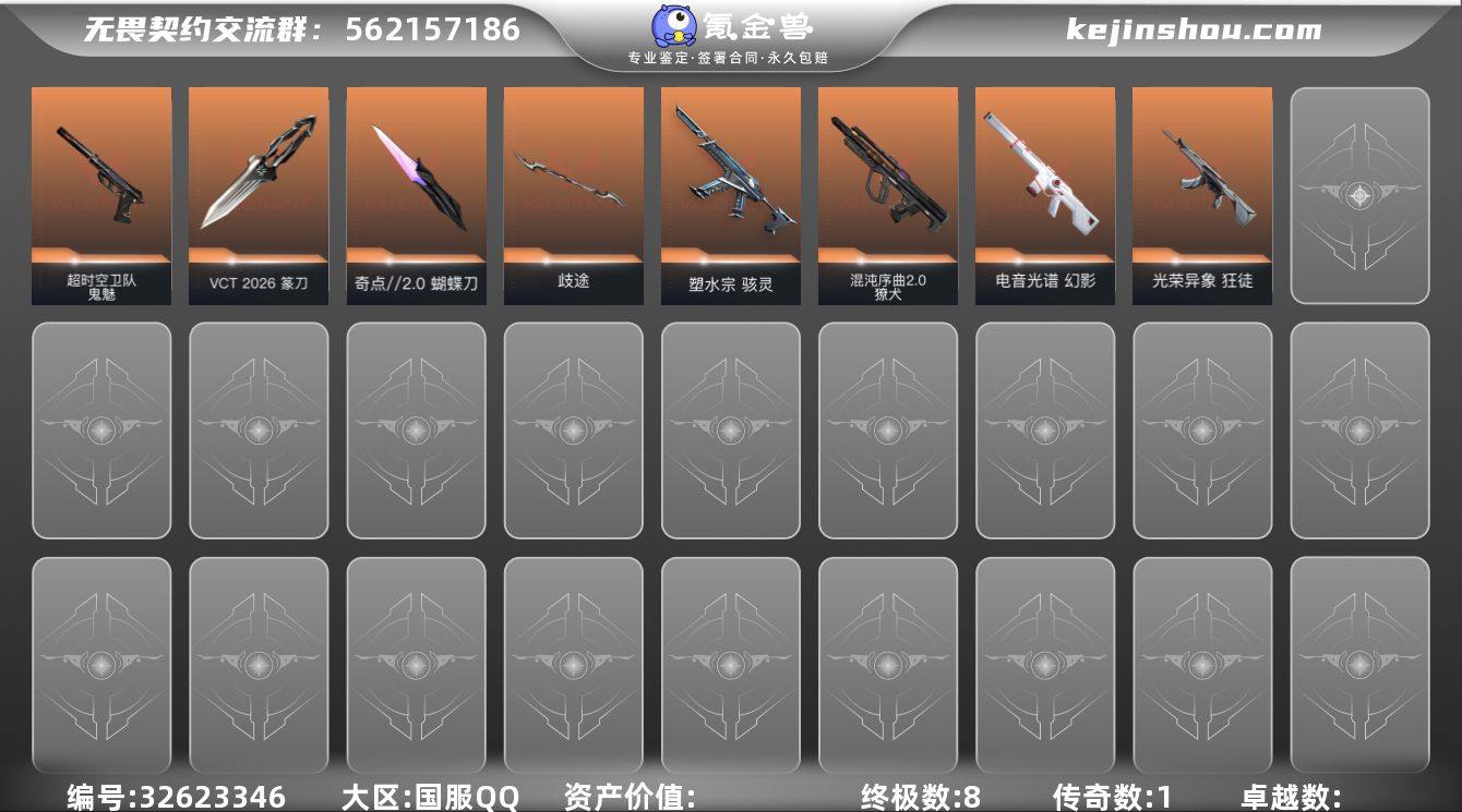 【套装】:VCT 2026 赛季套装 【英雄】:幻棱,炼狱,维斯,暮蝶,捷风,雷兹,不死鸟,贤者,猎枭,芮娜,尚勃勒,斯凯,黑梦 【近战武器】:近战武器-碎心裂刃,近战武器-VCT 2026 篆刀,近战武器-光荣异象 歧途,近战武器-奇点//2.0 蝴蝶刀 【狂徒】:狂徒-光荣异象 【幻影】:幻影-电音光谱,幻影-电音光谱 【獠犬】:獠犬-混沌序曲//2.0 【骇灵】:骇灵-塑水宗 【鬼魅】:鬼魅-超时空卫队 【卡面】:无畏契约GO!第一卷:零 卡面,《双城之战》金克丝 卡面,别冒尖 卡面,代号红色 卡面,新兵报到 卡面,V契约 卡面,无畏契约 卡面 【喷漆】:霓光四射 喷漆,买装还是存钱 喷漆,关门放狗 喷漆,红鳞 喷漆,无畏契约GO!第一卷:贤者 喷漆,暴走萝莉 喷漆,松叶 喷漆,放下武器 喷漆,胜利属于无畏契约 喷漆,GLHF 喷漆,无畏契约 喷漆 【挂饰】:V25第六幕:超凡 挂饰,无畏契约GO!第一卷 零 挂饰,天外飞客 挂饰,无畏契约 纪念币 挂饰