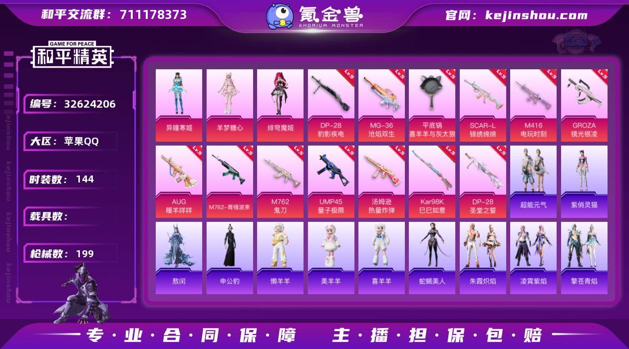 【8470】3粉装-14特效枪-0载具-2粉色飞行器-55865热力值-3王牌印记-144套装-199枪皮 【热门品类】:套装-浪漫天命,套装-龟仙人,套装-暗影哥特,套装-粉红小猪 【粉色套装】:角色-绯穹魔姬,角色-羊梦糖心,角色-异瞳寒姬 【粉色枪皮等级】:SCAR-L-锦绣绵绵(五级),M416-电玩时刻(五级),GROZA-镜光银凌(五级),AUG-暖羊咩咩(五级),M762-青锋波束(五级),M762-鬼刀(五级),UMP45-量子极限(五级),汤姆逊-热量炸弹(五级),Kar98K-巳巳如意(五级),Mk14-福马献瑞(四级),DP-28-圣堂之誓(五级),DP-28-豹影疾电(五级),MG-36-沧焰双生(五级),平底锅-喜羊羊与灰太狼(七级)