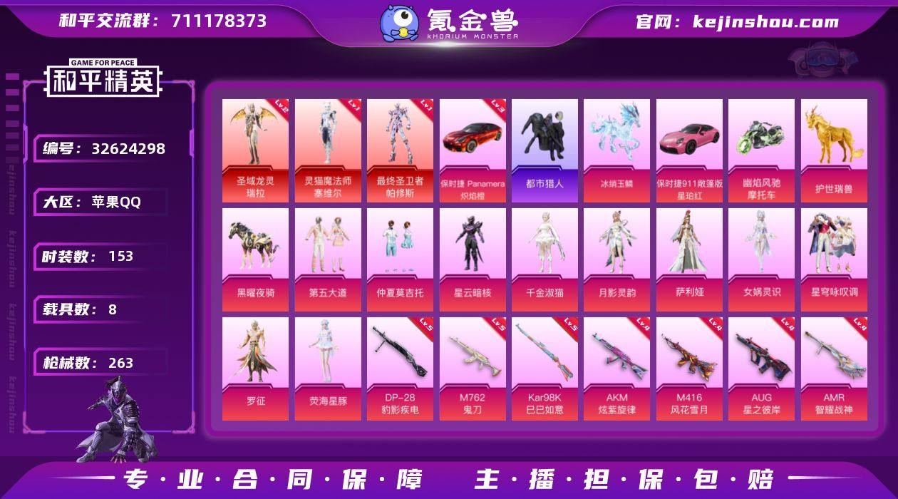 【kyhp1170】苹果 手Q-4神装-12粉装-18特效枪-8载具-22粉色飞行器-103453热力值-7王牌印记-153套装-263枪皮 【红色载具】:保时捷Panamera(炽焰橙)(三级) 【红色神装等级】:灵驹仙姬-云歌(三级),灵猫魔法师-塞维尔(一级),最终圣卫者-帕修斯(一级),圣域龙灵-瑞拉(二级) 【红色角色神装】:灵驹仙姬-云歌,灵猫魔法师-塞维尔,最终圣卫者-帕修斯,圣域龙灵-瑞拉 【热门品类】:套装-都市猎人,套装-龟仙人 【粉色套装】:粉装-第五大道,粉装-仲夏莫吉托,角色-星云暗核,角色-千金淑猫,角色-月影灵韵,角色-萨利娅,角色-女娲灵识,粉装-星穹咏叹调,角色-罗征,角色-荧海星豚,角色-辉云木星,角色-辉光之愿 【粉色枪皮等级】:AKM-炫紫旋律(四级),AKM-暮色玫影(三级),SCAR-L-魔童闹海 哪吒(三级),M416-风花雪月(四级),M416-灵猫魔法师(三级),M416-天马神君(三级),AUG-星之彼岸(四级),M762-鬼刀(五级),ACE32-萌骑漫游(五级),UMP45-宁雨蝶(三级),Vector-最终圣卫者(三级),AKS-74U-森灵之息(二级),P90-魔童闹海 敖丙(三级),Kar98K-巳巳如意(五级),Mk14-福马献瑞(三级),AMR-智耀战神(四级),DP-28-豹影疾电(五级),MG3-辉羽雀灵(三级) 【粉色载具】:保时...