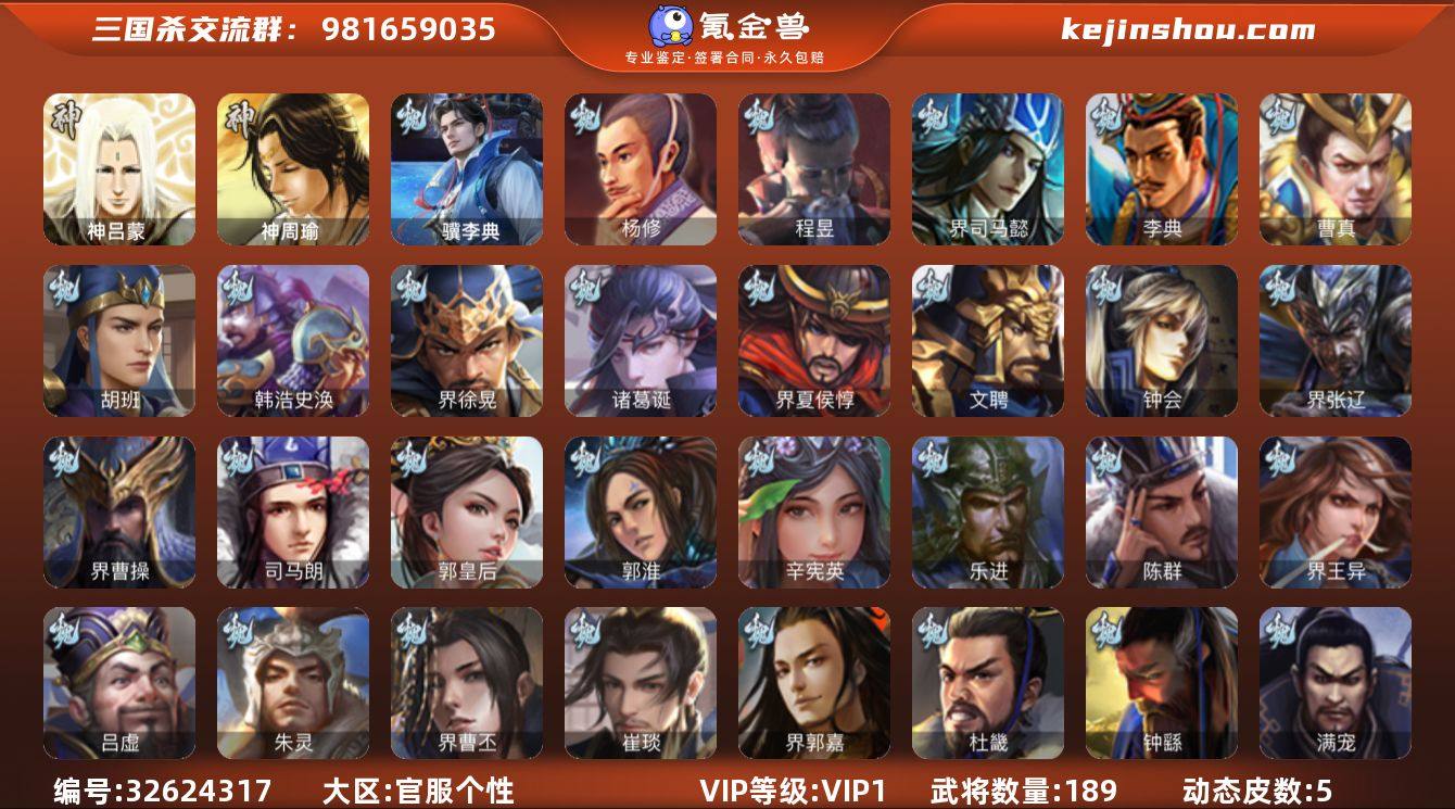5史诗中军,6万豆,骆统,回廊动态诸葛瞻,左慈,杨修,程昱5史诗,金皮神周瑜,神吕蒙,动态界曹植,动态界曹丕,金皮关银屏,带皮崔琰,谋高顺,张恭,胡班,金皮界王异,彭恙,界马超,界于吉,骥李典,荀谌,动诸葛亮189将,国战65将,1.9万羽毛,满级活树
