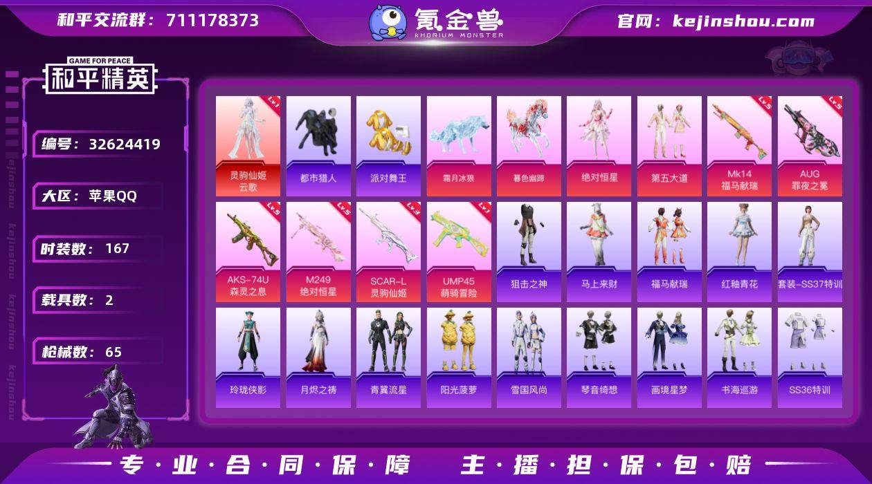 实名: 不可修改 时装数: 167 载具数: 2 枪械数: 65 战备数: 62 神级装扮: 灵驹仙姬-云歌 热门装扮: 鹰眼刺客,都市猎人,派对舞王,第五大道,绝对恒星 载具: 暮色幽蹄,霜月冰狼 稀有枪皮: M249-绝对恒星,AKS-74U-森灵之息,AUG-罪夜之冕,SCAR-L-灵驹仙姬,UMP45-萌骑冒险 亮点: 王者有自尊宝