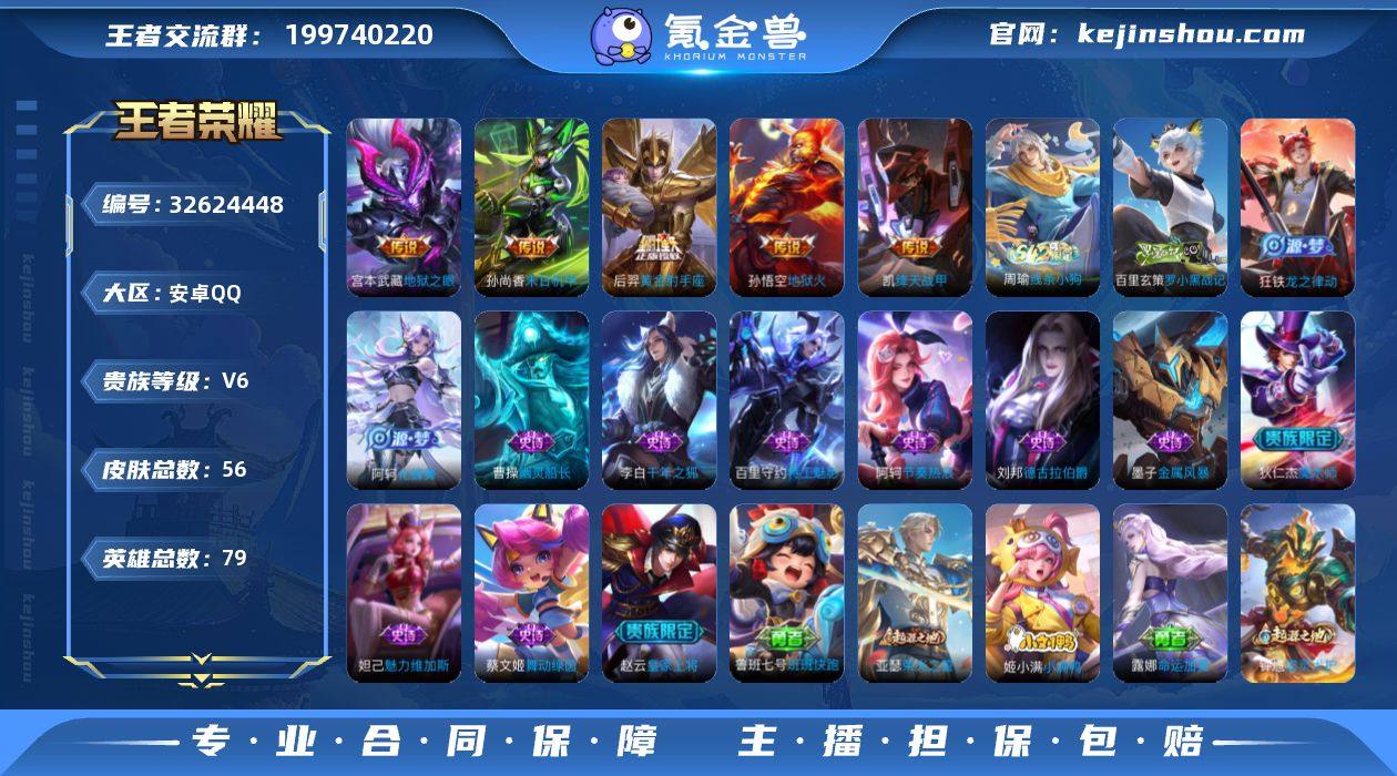 W15038 可立即换绑无需挂单养号 铭文满级 传说5 夺宝50 安卓Q-V6-至尊星耀III段位-79英雄-56皮肤-5传说-13史诗 【传说皮肤】:铠绛天战甲,后羿黄金射手座,孙尚香末日机甲,宫本武藏地狱之眼,孙悟空地狱火 【限定皮肤】:白起狰,狄仁杰阴阳师,赵云皇家上将,曹操烛龙,狄仁杰魔术师,项羽海滩派对,太乙真人饕餮 【赛季限定】:白起狰,太乙真人饕餮,曹操烛龙,太乙真人谧流熔炉,钟馗虚灵犬护,亚瑟荣光之誓 【战令限定】:周瑜线条小狗 【史诗皮肤】:周瑜线条小狗,百里玄策罗小黑战记,狂铁龙之律动,阿轲化蝶舞,阿轲节奏热浪,蔡文姬舞动绿茵,百里守约特工魅影,刘邦德古拉伯爵,李白千年之狐,曹操幽灵船长,墨子金属风暴,妲己魅力维加斯,狄仁杰魔术师,赵云皇家上将 【其他皮肤】:鲁班七号班班快跑,亚瑟荣光之誓,姬小满小满鸭,露娜命运加冕,钟馗虚灵犬护,明世隐景韶洛都,达摩爆裂喵拳,西施雪境奇遇,太乙真人谧流熔炉,刘禅秘密基地,吕布野性能量,李白敏锐之力,狂铁命运角斗场,曹操烛龙,太乙真人饕餮,白起狰,关羽龙腾万里,狄仁杰阴阳师,亚瑟死亡骑士,妲己少女阿狸,芈月红桃皇后,赵云忍炎影,赵云白执事,阿轲致命风华,露娜哥特...