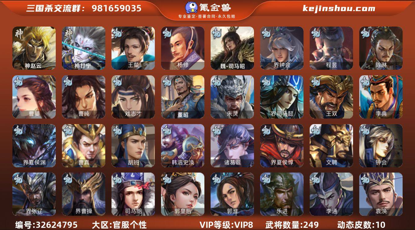 VIP等级: VIP8 官阶: 骠骑将军 武将数量: 249 动态皮肤数量: 10 神将: 神甘宁,神赵云 魏国武将: 戏志才,曹纯,曹婴,陈琳,程昱,界钟会,魏-司马昭,杨修,王粲,张辽,SP蔡文姬,SP关羽,SP贾诩,SP姜维,卞夫人,曹昂,曹操,曹冲,曹洪,曹丕,曹仁,曹叡,王异,鲁芝,界满宠,界曹植,满宠,荀攸,钟繇,郭嘉,荀彧,崔琰,朱灵,界王异,华歆,陈群,袁涣,李通,乐进,郭淮,郭皇后,夏侯惇,曹植,司马朗,界曹操,许褚,界张辽,张郃,钟会,文聘,曹彰,界夏侯惇,诸葛诞,司马懿,甄姬,徐晃,韩浩史涣,胡班,曹真,典韦,界夏侯渊,夏侯渊,李典,于禁,王双,邓艾,界司马懿,朱灵(国战),董昭 蜀国武将: 沙摩柯,张星彩,谋马超,谋赵云,谋黄月英,徐庶,吕凯,界关羽,界诸葛亮,邓芝,界伊籍,界黄月英,界张嶷,赵云,张松,彭羕,李丰,界刘备,刘封,黄月英,关羽,吴懿,祝融,张飞,陈震,魏延,界法正,糜夫人,刘禅,谋诸葛亮,张翼,SP孙尚香,SP徐庶,卧龙诸葛,周仓,界关兴张苞,诸葛亮,界张飞,法正,陈到,界马岱,关平,庞统,诸葛果,马谡,马超,霍峻,来敏,廖化,关兴张苞,孟获,夏侯氏,姜维,黄忠,刘备,界马超,李严,马良,傅肜,刘谌,彭羕(国战),甘夫人,SP甘夫人,势陈祗 吴国武将: 界徐盛,界朱然,骆统,周泰,全琮,吕蒙,诸葛恪,界孙尚香,大乔小乔,桥公,丁奉,界全琮,...