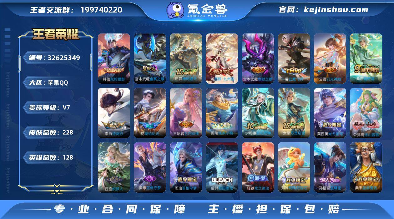 【特价出售/店主推荐】:苹果Q-V7-永恒钻石I段位-128英雄-228皮肤-1典藏皮肤-1星元-9传说-76史诗 【英雄全皮】:孙权全皮,敖隐全皮,空空儿全皮 【荣耀典藏】:韩信弑枪猎影 【传说皮肤】:后羿神树通天,澜愿照九州拓,云缨幻光神枪,桑启鸣野蒿,铠琥珀纪元,李白诗剑行,王昭君乞巧织情,曜云鹰飞将,宫本武藏地狱之眼 【限定皮肤】:蒙犽顽岩魄,蔡文姬夏日便利店,大乔绒语心约,虞姬夏日便利店,姜子牙天穹之誓,杨戬破阵退雄兵,李白谪仙醉月,狄仁杰阴阳师,赵云皇家上将,赵云引擎之心,鲁班七号狮舞东方,阿轲迷踪丽影,扁鹊奇幻香踪,元歌云间偶戏,甄姬游园惊梦,典韦蓝屏警告,马可波罗暗影游猎,狄仁杰魔术师,项羽海滩派对,孙悟空至尊宝,孙悟空大圣娶亲,李元芳银河之约,米莱狄胡桃异想国,蒙犽狂想玩偶喵,阿古朵江河有灵,张良古海寻踪,鬼谷子天穹祈灯,铠琥珀纪元,姬小满妄想食味,沈梦溪龙舞盛年,鲁班七号蔬乡物语,李元芳蔬乡物语,刘邦剑破天穹,程咬金群星魔术团,镜青焰无极,项羽苍威无极,刘备异域游侠,周瑜熔金海岸 【年限皮肤】:澜愿照九州拓 【赛季限定】:张良古海寻踪,鬼谷子天穹祈灯,刘邦剑破天穹,姜子牙天穹之誓,东皇太一噬灭天...