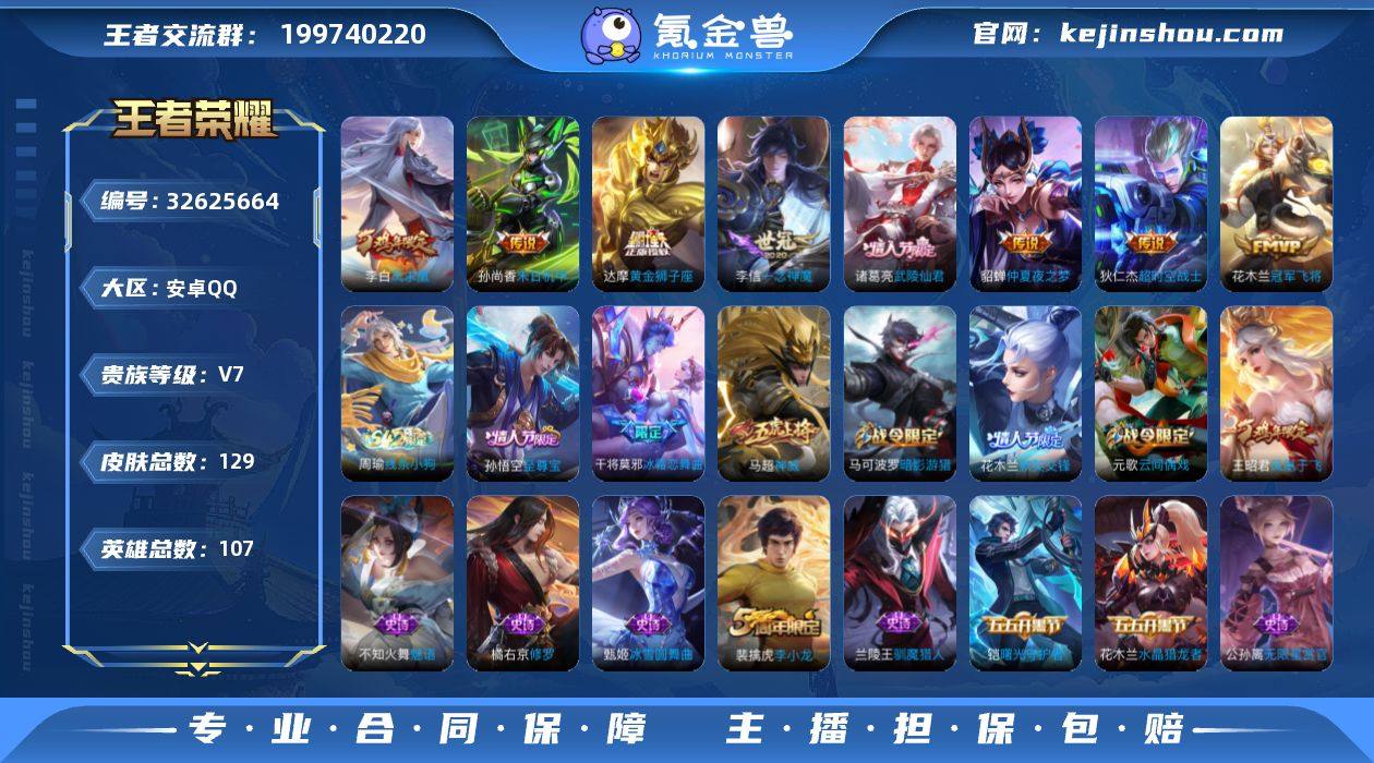 安卓Q-V7-荣耀黄金II段位-107英雄-129皮肤-8传说-36史诗 【传说皮肤】:李信一念神魔,达摩黄金狮子座,花木兰冠军飞将,诸葛亮武陵仙君,貂蝉仲夏夜之梦,李白凤求凰,孙尚香末日机甲,狄仁杰超时空战士 【限定皮肤】:白起狰,狄仁杰阴阳师,赵云皇家上将,阿轲迷踪丽影,孙膑天狼运算者,周瑜赤莲之焰,元歌云间偶戏,夏侯惇朔风刀,马可波罗暗影游猎,狄仁杰魔术师,狄仁杰万华元夜,达摩沙漠行僧,项羽海滩派对,老夫子醍醐杖,程咬金演武夺筹,刘邦夺宝奇兵,王昭君凤凰于飞,兰陵王驯魔猎人,兰陵王金庭之子,花木兰默契交锋,亚瑟潮玩骑士王,孙悟空至尊宝,牛魔御旌,钟馗驱傩正仪,干将莫邪冰霜恋舞曲,蔡文姬繁星吟游,太乙真人饕餮,鬼谷子原初探秘者,诸葛亮武陵仙君,苏烈千军破阵,百里玄策原初追逐者,弈星混沌棋,明世隐疑决卦,裴擒虎李小龙,米莱狄御霄,云中君纤云弄巧,盾山御銮,猪八戒西部大镖客,上官婉儿梁祝,艾琳女武神 【年限皮肤】:王昭君凤凰于飞,李白凤求凰 【赛季限定】:白起狰,太乙真人饕餮,米莱狄御霄,牛魔御旌,盾山御銮,夏侯惇朔风刀,弈星混沌棋,明世隐疑决卦,老夫子醍醐杖,鬼谷子原初探秘者,狄仁杰万华元夜,程咬金演武夺筹...