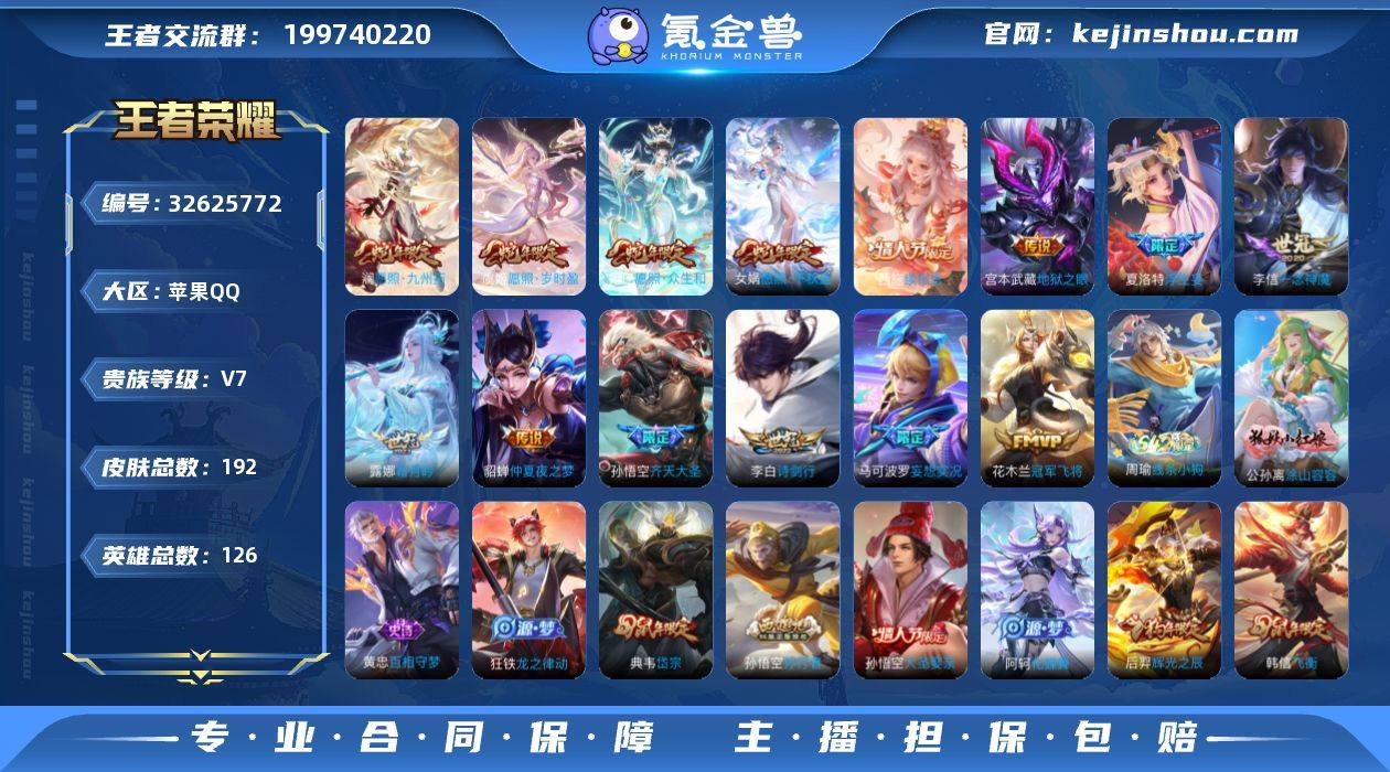 苹果Q-V7-最强王者段位-126英雄-192皮肤-14传说-46史诗 【英雄全皮】:孙权全皮 【传说皮肤】:西施续相思,女娲愿照千秋盛,妲己愿照众生和,澜愿照九州拓,虞姬愿照岁时盈,露娜霜月吟,马可波罗妄想实况,夏洛特浮生妄,孙悟空齐天大圣,李白诗剑行,李信一念神魔,花木兰冠军飞将,貂蝉仲夏夜之梦,宫本武藏地狱之眼 【限定皮肤】:狄仁杰阴阳师,赵云皇家上将,孙尚香蔷薇恋人,高渐离玩趣恶龙,元歌无心,夏侯惇朔风刀,典韦岱宗,马可波罗妄想实况,狄仁杰魔术师,狄仁杰万华元夜,达摩星际陆战队,达摩沙漠行僧,项羽海滩派对,老夫子醍醐杖,程咬金演武夺筹,韩信逐梦之影,韩信飞衡,兰陵王金庭之子,孙悟空大圣娶亲,孙悟空孙行者,孙悟空齐天大圣,牛魔御旌,后羿辉光之辰,李元芳银河之约,李元芳云中旅人,钟馗驱傩正仪,鬼谷子原初探秘者,鬼谷子五谷丰年,苏烈千军破阵,弈星混沌棋,沈梦溪星空之诺,沈梦溪大漠名商,明世隐疑决卦,裴擒虎擒涛扼浪,米莱狄御霄,米莱狄胡桃异想国,云中君纤云弄巧,盾山御銮,桑启海盐诗旅,夏洛特浮生妄,鬼谷子天穹祈灯,刘邦剑破天穹 【年限皮肤】:后羿辉光之辰,典韦岱宗,韩信飞衡,女娲愿照千秋盛,妲己愿照众生和,...
