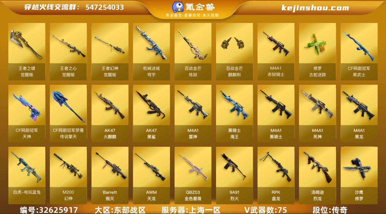 【ky6104】上海一区-80V-8王者武器数-0炫金武器数 【热门武器】:QBZ03-金色蔷薇,M200-幻神,修罗-古蛇迷踪,死亡之眼,荣耀世冠-雷神,白虎-电玩蓝兔,荣耀世冠-柯尔特,M4A1-黑骑士,汤姆逊-烈龙*5,RPK-盘龙*2,COP-白鲨,USP-雷暴,沙鹰-修罗*2,荣耀世冠-龙啸 【王者炫金武器】:王者之魄高爆手雷,王者之魄闪光弹 【音效卡】:M200-幻神音效卡,AK47-火麒麟音效卡,M4A1-雷神音效卡,M4A1-黑骑士音效卡,Barrett-毁灭音效卡,Barrett-碧霄极光音效卡,炼狱-百战金芒-庆典舞曲音效卡 【皮肤】:幻神-冠军之幻,幻神-丹凤,金色蔷薇-电竞之星 皮肤,雷神-暗月,雷神-烈虎皮肤,雷神-机甲刑天皮肤,雷神-宇航兔皮肤,雷神-源计划2.0专属 皮肤,M4A1-再燃火线,雷神-神秘按键 皮肤,火麒麟-AG战队皮肤,火麒麟-雷神,火麒麟-冠军之心,火麒麟-平天大圣,火麒麟-百城,毁灭-AG-CFPLS15冠军,毁灭-黑大圣皮肤,毁灭-风暴,毁灭-英雄计划 皮肤,M4A1-千变-孔明皮肤,黑龙-能量核心,黑骑士-暗月,黑骑士耀金皮肤,战神-粉色甜心皮肤,战神-流金岁月皮肤,AK47-B-常胜将军-曹操,AK47-B-常胜将军-刘备,AK47-B-常胜将军-孙权,AWM-天龙-传奇70KG,AWM-天龙-传奇白鲨,修罗-能量...