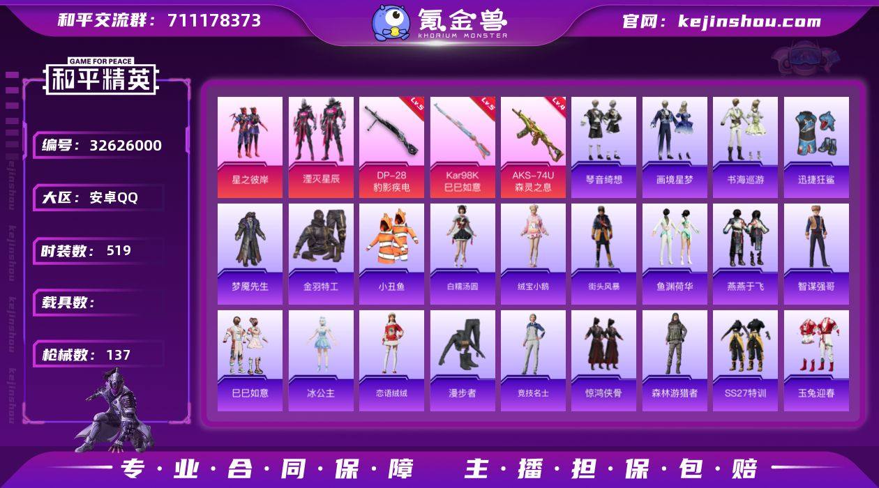 【特价出售】安卓Q-2粉装5特效枪10热门130套装137枪皮 37328热力值 4印记 历史传奇王牌15星 【2粉装】 湮灭星辰 星之彼岸 【5特效枪】 AKS-74U-森灵之息 (4级) Kar98K-巳巳如意 (5级) DP-28-豹影疾电 (5级) Mk14-福马献瑞 (5级) UMP45-萌骑冒险 (5级) 【10热门】 小丑鱼 龟仙人 梦魇先生 迅捷狂鲨 金羽特工 粉红小猪 漫步者 破蛋小黄鸡 极速红龙 军刀雅典娜