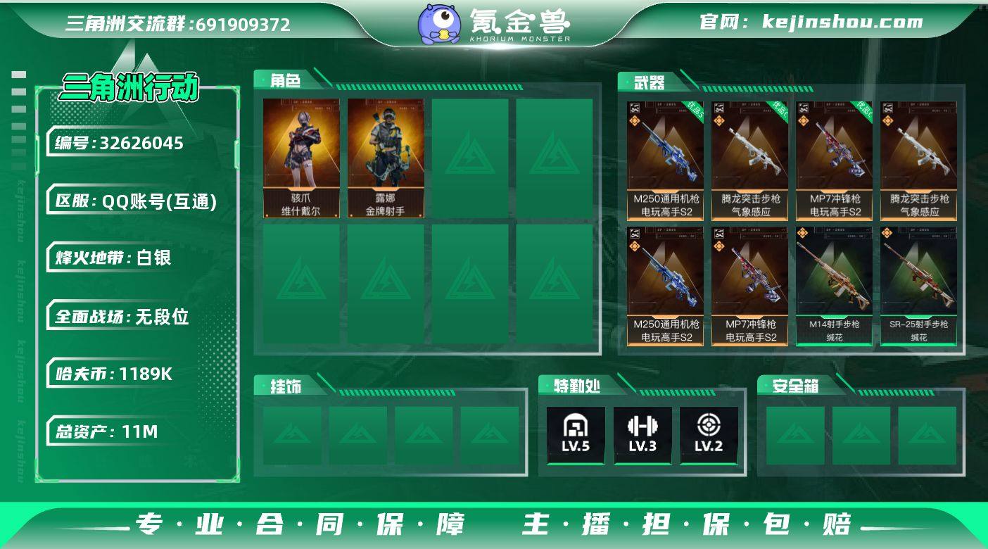 【5199】总资产(M):11M/哈夫币(K):1189K/哈夫币(K):1189K/传说枪皮数:10/全面战场等级:1_段位:无段位/烽火地带等级:60_段位:白银/骇爪-维什戴尔/露娜-金牌射手(S7)/近战-黑鹰/腾龙突击步枪-气象感应/M250通用机枪-电玩高手S2/MP7冲锋枪-电玩高手S2/优品C典藏武器外观-腾龙突击步枪-气象感应/优品S典藏武器外观-M250通用机枪-电玩高手S2/优品C典藏武器外观-MP7冲锋枪-电玩高手S2/SG552突击步枪-运动员/SCAR-H战斗步枪-启航/M14射手步枪-蛮荒/M14射手步枪-缄花/SR-25射手步枪-缄花/R93狙击步枪-维什戴尔/.357左轮-缄花/K416突击步枪-冬日风情/M7战斗步枪-百步穿杨/SG552突击步枪-哈夫克警备/G3战斗步枪-流沙送葬/G3战斗步枪-哈夫克警备/AS Val突击步枪-百步穿杨/MP5冲锋枪-战术竞备/Vector冲锋枪-百步穿杨/SMG45冲锋枪-阿萨拉特攻/M249轻机枪-丛林谍踪/M250通用机枪-囚徒/VSS射手步枪-丛林谍踪/SVD狙击步枪-阿萨拉工艺/M700狙击步枪-百步穿杨/AWM狙击步枪-流沙送葬/QBZ95-1突击步枪-海岸线/R93狙击步枪-精湛工艺/野牛冲锋枪-千里骏骨/M4A1突击步枪-零点/M4A1突击步枪-繁盛/ASh-12战斗步枪-繁盛/K416突击步枪-碳纤维/M7战斗步枪-捣蛋鬼/SG552突击步枪-2026/SG552突击步枪...