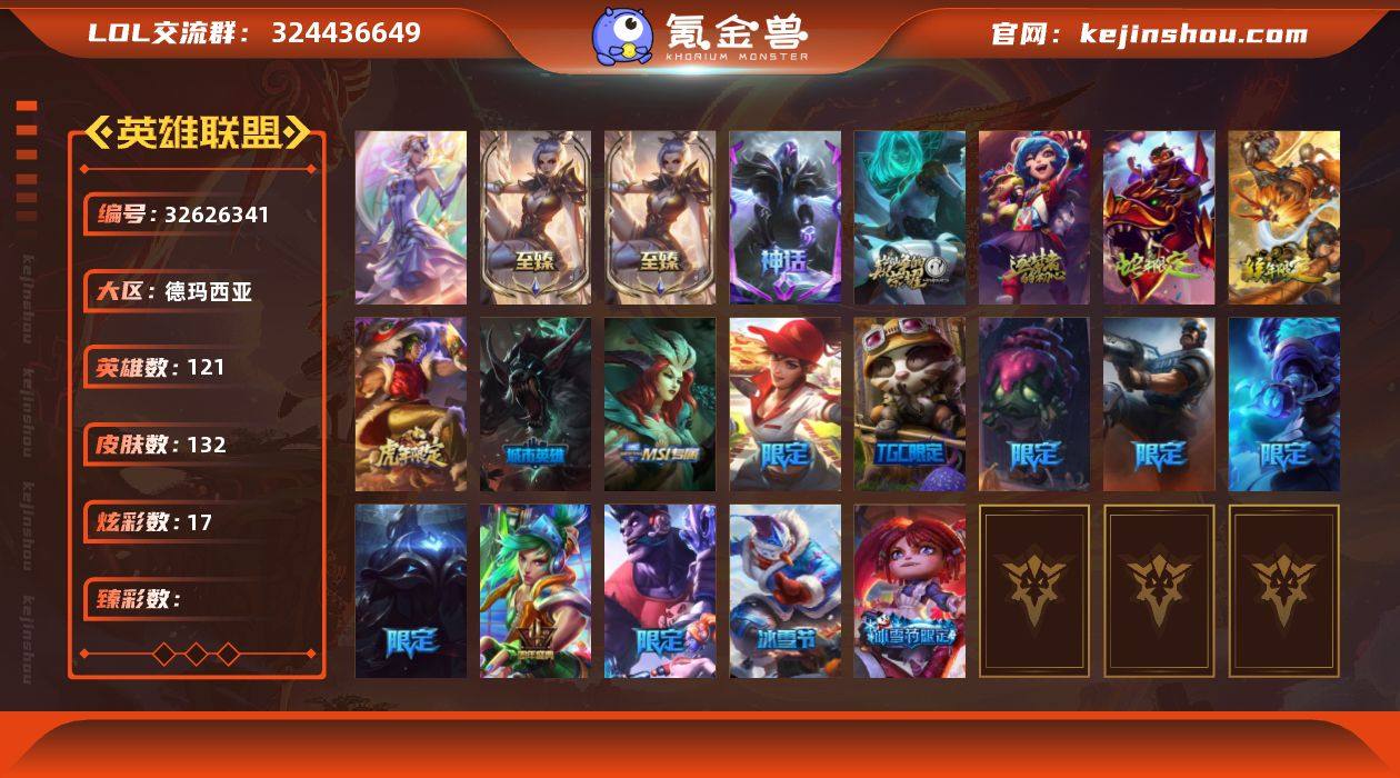 未定级段位-121英雄-132皮肤-17炫彩-1终极-5神话-19限定-19传说-31史诗 【热门头像】:爱意绵绵头像 【神话皮肤】:十周年纪念安妮,源代码乐芙兰,灰烬骑士派克 【至臻皮肤】:至臻玉剑传说武剑仙锐雯,至臻玉剑传说武剑仙(2022) 【年限皮肤】:神龙之翼库奇,美猴王孙悟空,龙腾虎跃瑟提 【冰雪限定】:持胡萝卜的雪人易,圣诞狂欢努努和威朗普,圣诞玩偶波比 【终极皮肤】:大元素使拉克丝 【限定皮肤】:送披萨的小姐姐希维尔,冠军典狱长锤石,冠军之隐劫,暗杀星蒙多,电玩勇者锐雯,大魔法锅布里茨,无头骑士赫卡里姆,魅惑女巫莫甘娜,密林猎手提莫,暗影沃里克,永恒之森乐芙兰,防暴士兵格雷福斯,惊悚派对阿木木 【传说皮肤】:地狱之门卫士加里奥,战场女武神凯尔,钢铁之翼凯尔,源计划林易,绅士科加斯,双重冰晶艾尼维亚,陆地王者4WD布里茨,苹果机器人布里茨,神龙尊者圣龙李青,源计划净化薇恩,炼狱魔犬内瑟斯,神王盖伦,冰霜亚龙希瓦娜,偶像歌手阿狸,宇航员诺提勒斯,奥德赛凯隐,西部魔影卢锡安,天煞劫,暗星锤石 【史诗皮肤】:绞肉机角斗士赵信,源代码索拉卡,兔宝宝提莫,火牙狼人沃里克,国王泰达米尔,殇之机器人阿木木,熔火之心拉莫斯,战争...