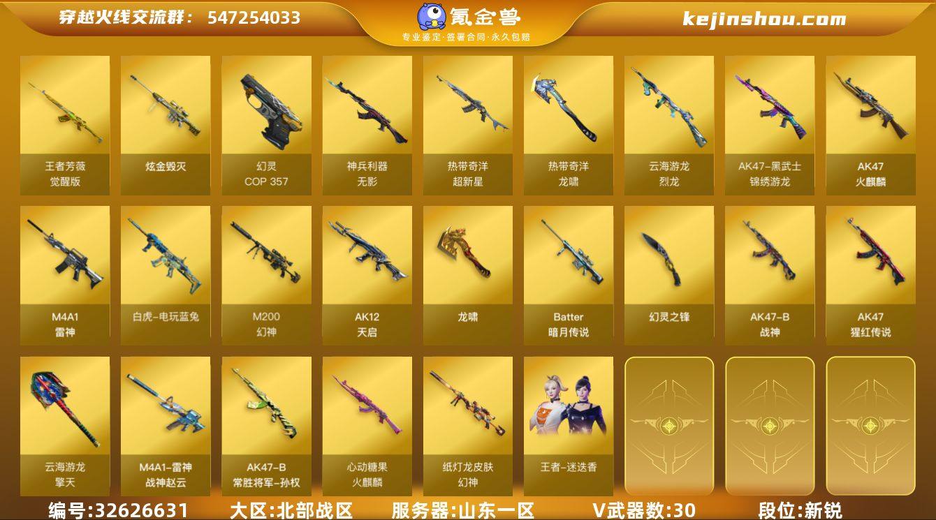 山东一区-28V-1王者武器数-1炫金武器数 【热门武器】:M200-幻神,白虎-电玩蓝兔,COP 357-幻灵 【王者炫金武器】:炫金毁灭 【皮肤】:幻神-纸灯龙皮肤,M4A1-战神赵云,雷神-源计划2.0专属 皮肤,火麒麟-心动糖果,AK47-B-常胜将军-孙权 【角色】:王者-迷迭香,奇洋探员,云海玲珑,北极狐-X,风暴女,嘉年华灵狐,麻雀,潘多拉-X,斯沃特-X 【人偶武器】:AWM-灵狐-15周年嘉年华,生化手雷-机甲核心,M4A1-斯沃特,迷你超能女侍 【挑战大师】:激光毁灭者III-白马银枪,神圣爆裂者-末日III 【英雄级武器】:AK47-火麒麟*2,M4A1-雷神,AK12-天启,无影-神兵利器,黑武士-锦绣游龙,超新星-热带奇洋,AK-47-猩红传说*2,AK47-B-战神,白虎-电玩蓝兔,王者芳薇-觉醒版,M200-幻神,Barrett-暗月传说*4,烈龙-云海游龙,COP 357-幻灵,龙啸,幻灵之锋,擎天-云海游龙,龙啸-热带奇洋,高爆手雷-幻灵,高爆手雷-竞技荣光,手雷-云海游龙,手雷-热带奇洋,闪光弹-幻灵,闪光弹-竞技荣光,烟雾弹-幻灵,烟雾弹-竞技荣光 【源级武器】:源·火麒麟*2,源·雷神*2,魂·雷神-维纳斯,魂·雷神-新春神龙,魂-雷神-萌杀,魂·雷神-15周年嘉年华,御·雷神-烈虎*3,M4A1-十二生肖·龙-雷神,...