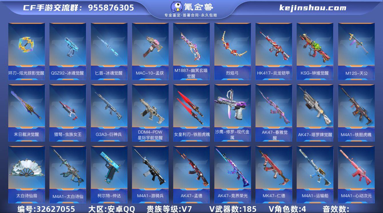 TZ2963【V7 王者之尊/蝶 王者之影/狱-冰霜奇迹 AK孟德过载 仁德 VVEPR12-宙斯】【等级】107【区服】手Q-安卓【金角色数】4【金武器数】185【金V角色】职场灵狐-赛事经理 虹儿 九安-X 宋雨琦【金V武器】AK47-幸运日 M4A1-黑骑士 高爆手雷-雷暴 闪光弹-雷暴 烟雾弹-雷暴 M4A1-太白诗仙 神罚战斧 AK47-黑鲨 QBZ03-金色蔷薇 黑武士闪光弹 闪光弹-雷暴 高爆手雷-雷暴 卡牌大师-悠悠 烟雾弹-雷暴 太白诗仙扇 巴雷特-毁灭 屠龙 炽芒蝶刃 AWM-大湾溢彩 闪光弹-雷暴 烟雾弹-雷暴 高爆手雷-雷暴 M4A1-心动次元 寒霜烈龙 AK12-天启 沙鹰-修罗 HK417-炎龙铠甲 黑骑士手雷 屠龙 机械纪元手雷 机械纪元闪光弹 机械纪元烟雾弹 燃烧弹-游骑兵 闪光弹-游骑兵 烟雾弹-游骑兵 M4A1-游骑兵 马来剑-毁灭 AK47-孟德 屠龙 屠龙 手斧-机械迷城 地狱烈炎 M4A1-死神 匕首-冰魂觉醒 AWM-天龙 屠龙 AK47-春雅觉醒 环刃-炫光掠影觉醒 王者之狱 CZ75-穷奇 81式-光明之神 USP-机械迷城 QSZ92-冰魂觉醒 尼泊尔-冰锋觉醒 RPK-盘龙 M4A1-黑龙 寒霜烈龙 丛林匕首-庆龙觉醒 QBB95-极光 USP-神罚 擎天 P90-突突兔觉醒 MAC-10-孟获 烈焰弓 USP-太白诗仙 USP-神罚 改装GLOCK-樱龙·超觉 FN F2000-十绝阵觉醒 樱龙刺·超...
